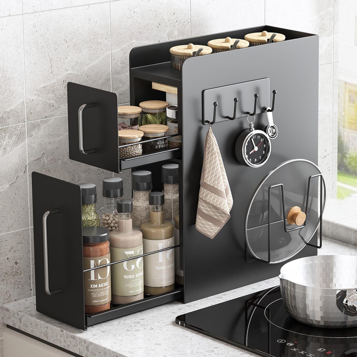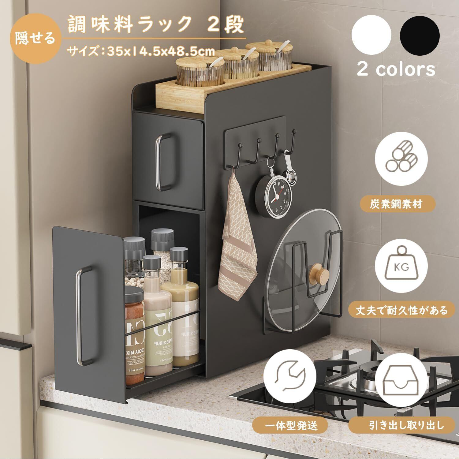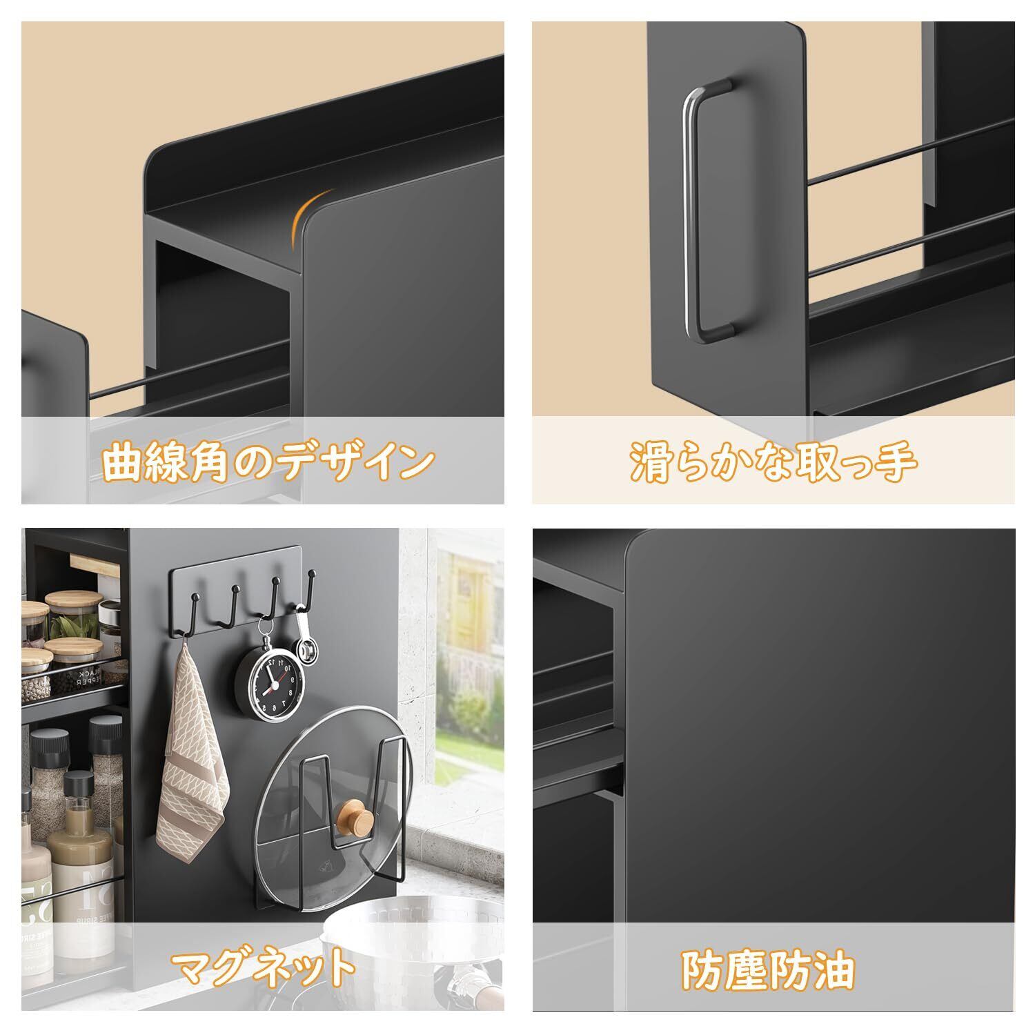 【在庫セール】隠せる調味料ラック 2段 調味料ラック台所用 大容量 引き出し スリム スパイスラック 隙間収納 大容量 おしゃれ スリム キッチン 収納 台所用 マグネット 鍋蓋ホルダー キッチンツールフック 付け (ブラック, 幅14.5X 奥行35X 高さ48.5cm)
