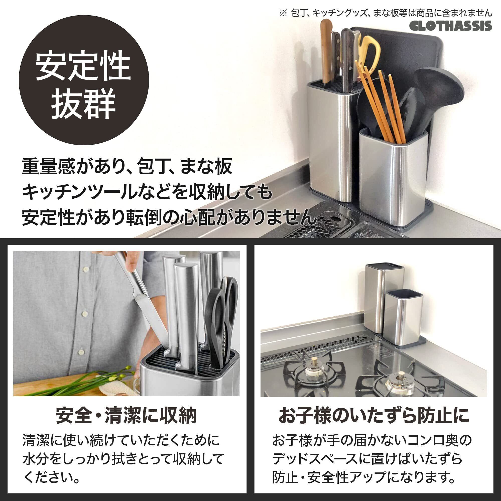 【お子様のいたずら防止に】シンク下に包丁など危険なものを収納しているとお子様が誤ってさわってしまわないか心配です。そんなときはグリルの奥のデッドスペースに設置するのがおススメです。安定性抜群なので包丁に加えて、まな板・おたまなどを収納しても倒れません。やや重量感があるのもグリル奥のスペースなら気になりません。