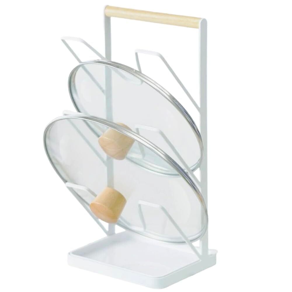 木目調のハンドルがアクセントになったシンプルな鍋蓋スタンドです。3段ラックとなっており、鍋の蓋やお玉置き、まな板ホルダー、菜箸置きとしてもご使用頂けます。