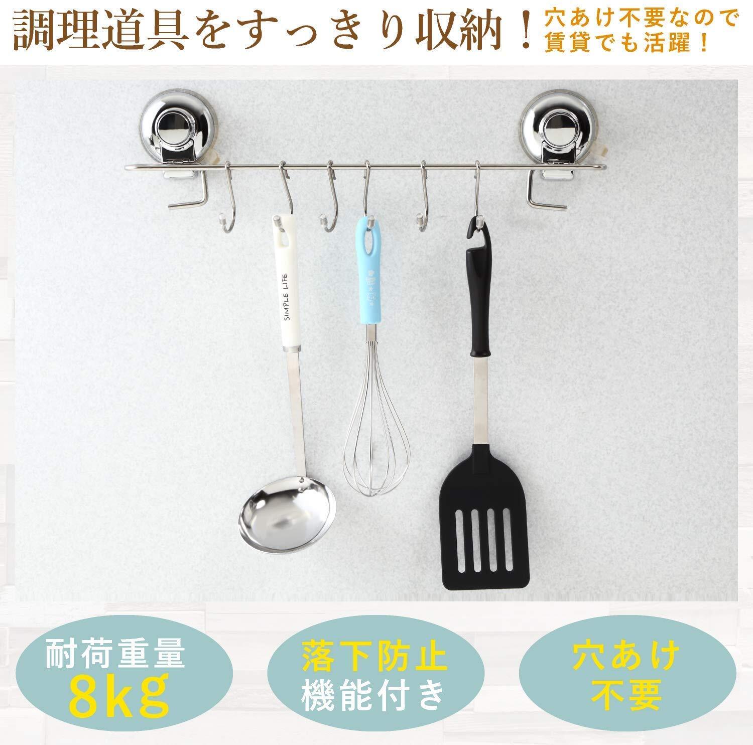 キッチンツールフック 強力 吸盤 壁掛け SUS304 ステンレス キッチン お風呂 浴室 タオルハンガー 防水 穴あけ 不要 フック6個付き