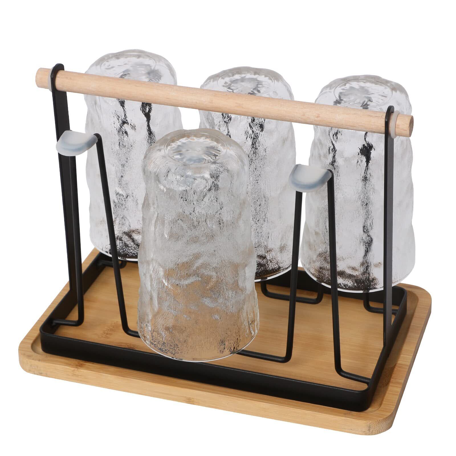 yazi グラススタンド コップホルダー 6個掛け ガラスホルダー 木製ハンドル付 北欧風 おしゃれでスリム キッチンツールスタンド ガラス収納乾燥 水切りラック シリコン滑り止め付 コップ立て (ブラック・木製トレイ)
