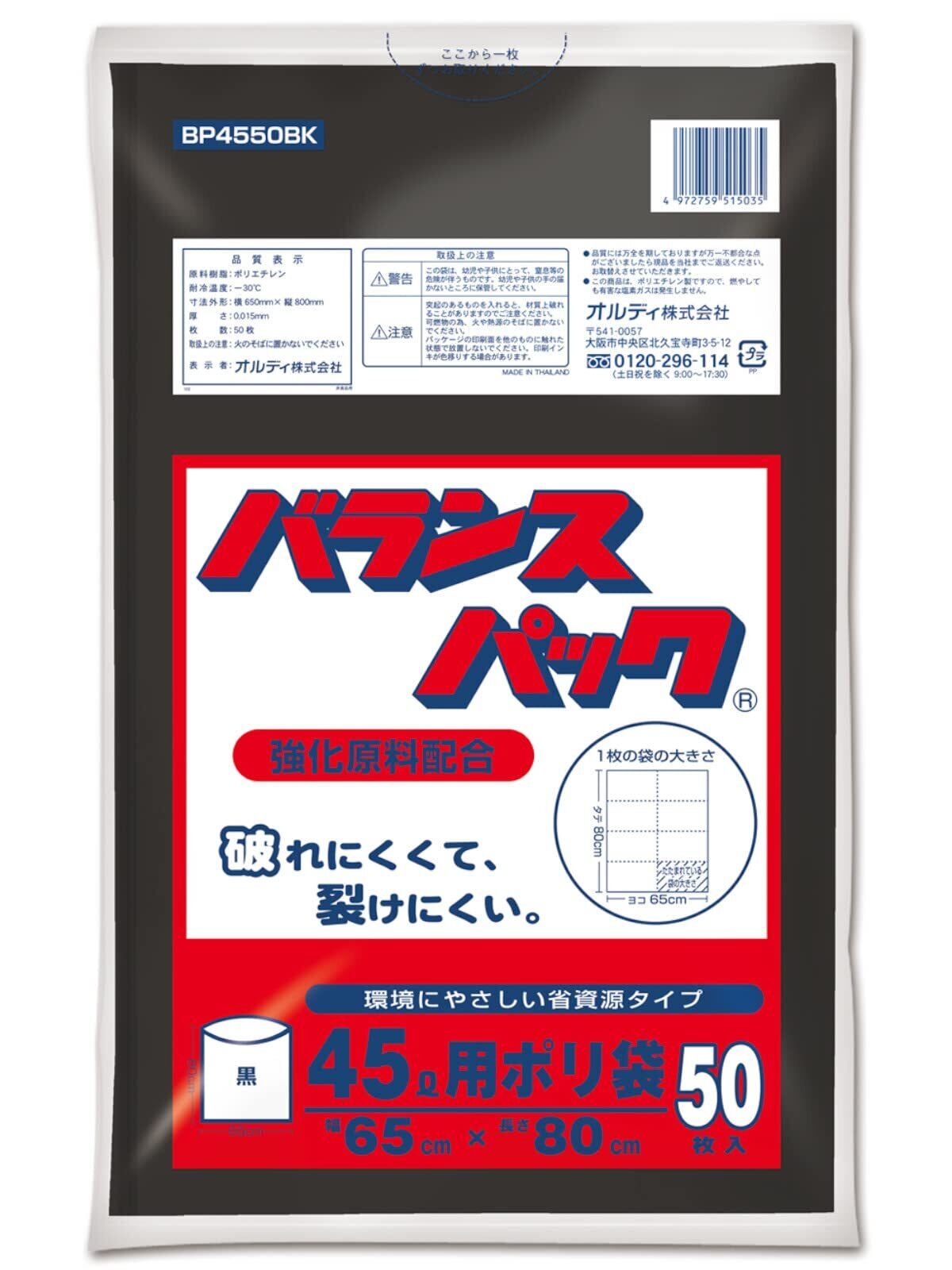 オルディ ごみ袋 黒 45L 50枚入 縦80cm×横65cm 強化原料配合 破れにくい 裂けにくい 防災用 災害時 非常時 収納 バランスパック BP4550BK
