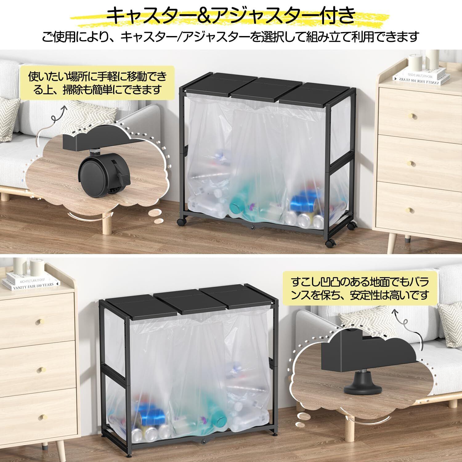 【1台で3分別できるゴミ箱】中身が見える3分別ゴミ袋ホルダーですので、瓶・缶・ペットボトル・プラスチックなどの資源ごみを分別することにぴったりする上、ゴミの量が一目でわかり、捨てるタイミングも計りやすくなります。何個のゴミ箱を置く必要がなく、1台でゴミを簡単に分別しながら捨てることかできます。商品仕様:キャスタータイプ組立後サイズ:約70*32.5*65cm アジャスタータイプ組立後サイズ:約70*32.5*61.5cm