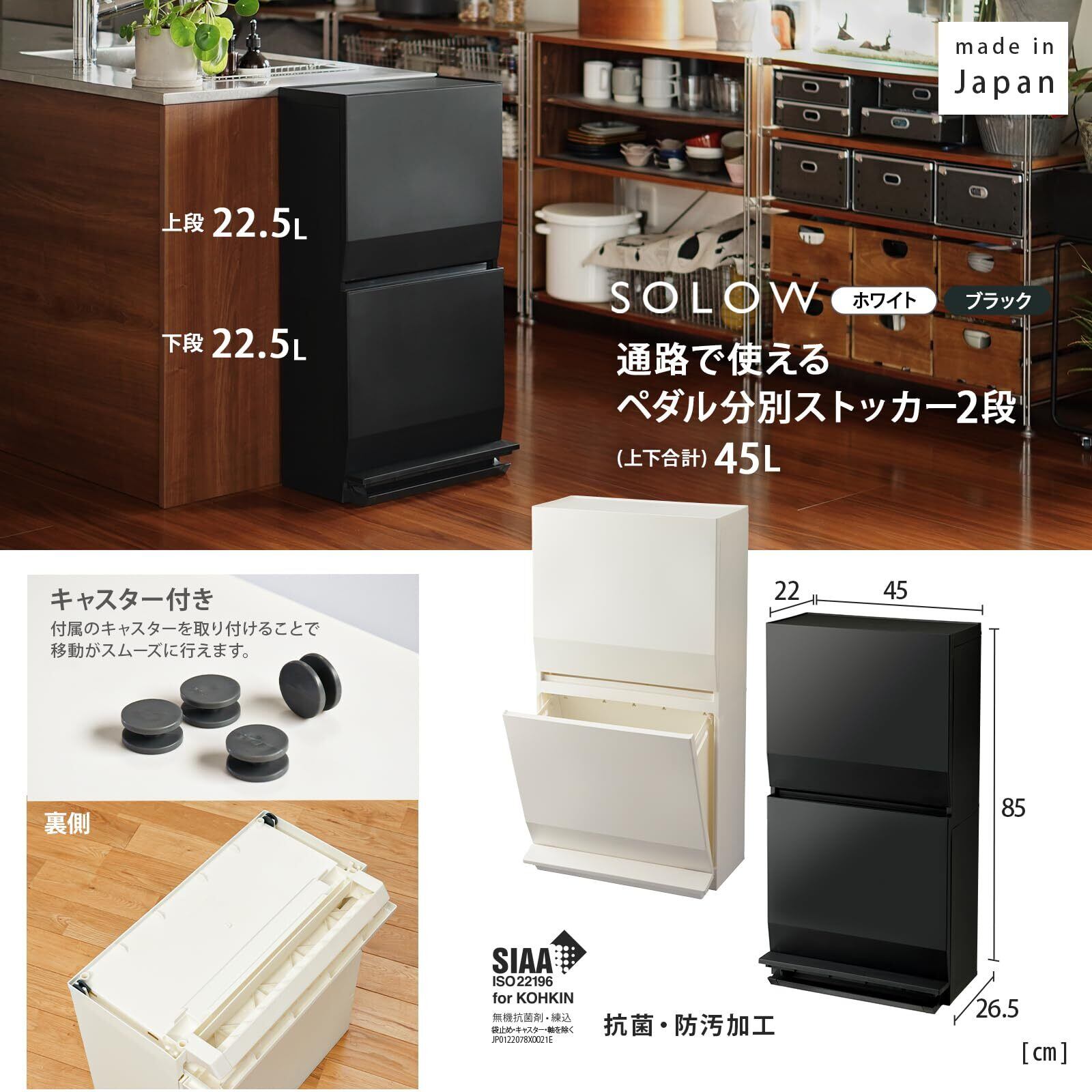 リス(RISU) ゴミ箱 ダストボックス SOLOW通路で使えるペダル分別ストッカー 2段 45L ブラック 日本製 上下 各 22.5L 大きく開く 薄型 抗菌 加工 おしゃれ キッチン シンプルなデザイン キャスター付き 収納にも GSLW021