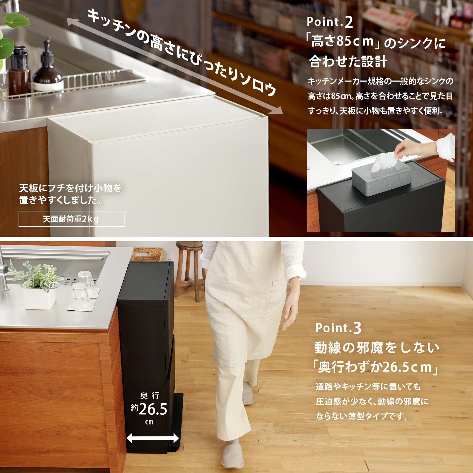 奥行きは本体部分で約22cm。ペダル部分を入れてもわずか約26.5cmの薄型スタイルで、壁際や通路に置いても人の動線を遮りません。