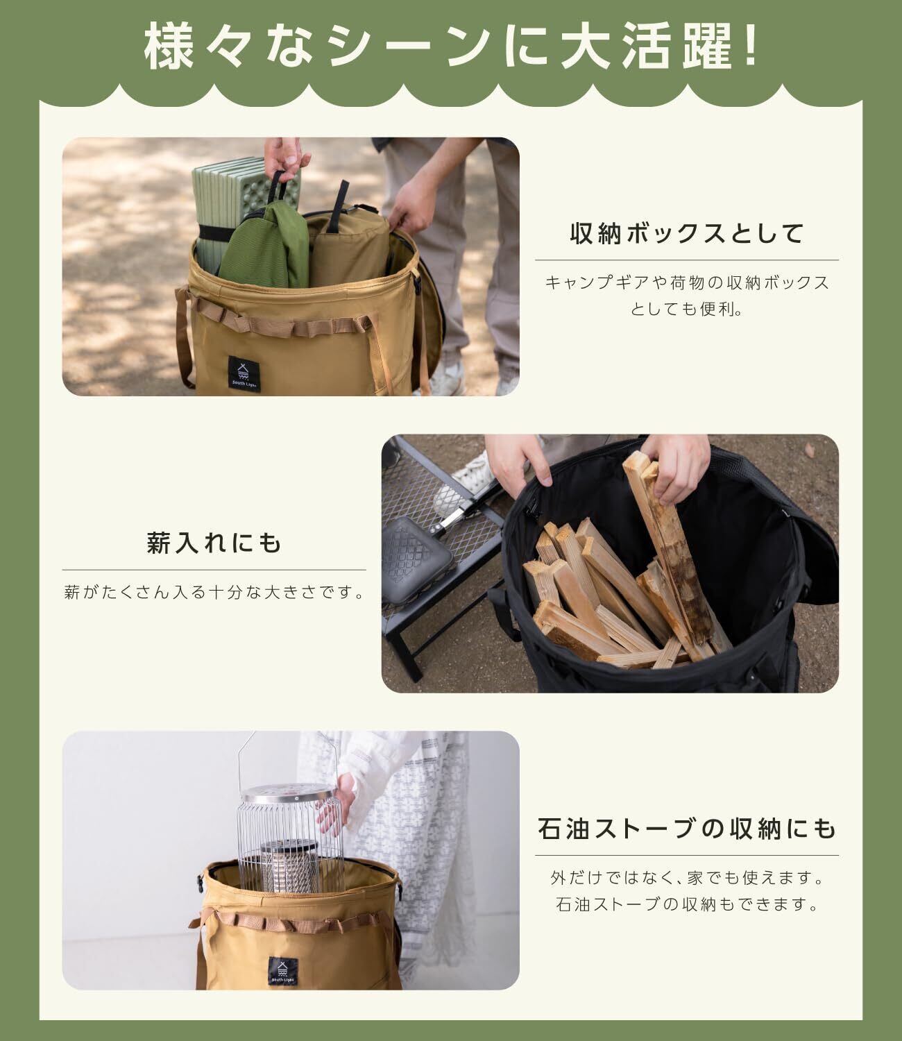 【様々なシーンに大活躍&製品仕様】このポップアップ収納袋は、アウトドアだけでなく、日常的な使用にも最適です。内部は防水加工が施されており、洗濯カゴとしても利用可能。キャップギアや荷物の収納ボックスとしても便利です。薪がたくさん入る十分な大きさで、バーベキューに行く際にも最適です。【製品仕様】 製品名:トラッシュボックス 。カラー:グリーン/ブラック/レザーブラウン。材質:ポリエステル、PVC サイズ:組立時 約Ø41×H47㎝ 収納時 約Ø41×H4㎝ 重量:約0.98kg 耐荷重:約8kg 同梱品:本体×1。