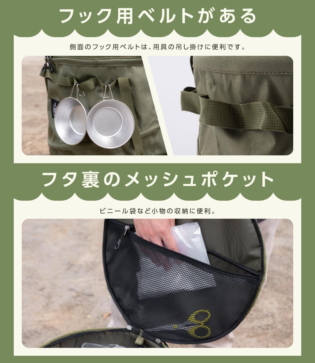 【ポップアップ式トラッシュボックス】このアウトドア用ポップアップ収納袋は、筒型のデザインで広々とした60Lの大容量を誇ります。底部は防水仕様で、キャンプやアウトドアでの使用に最適です。ゴミ箱として使え、薪入れなどキャンプ用品の収納ボックスとして便利です。取り扱いは自動的に広がるホップアップ式で、バックルを外すとあっという間に展開します。