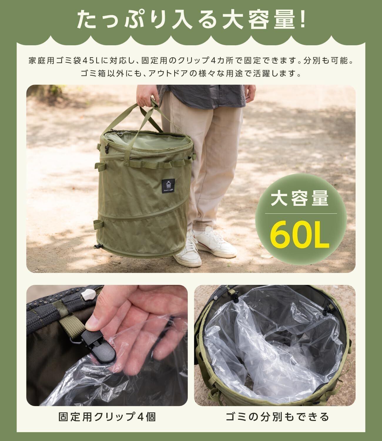 【たっぷり入る60L大容量&防水加工】ボックスは高さ47㎝の筒型。容量は約60Lの大容量。家庭用半透明ゴミ袋45Lに対応し、開口部4ケ所のクリップに取り付け。小さめのビニール袋を使って分別もできます。表面はポリエスレルの厚地生地。底面は防水PVC。湿った芝生など湿地でも安心して設置できて、お手入れも拭くだけで簡単です。