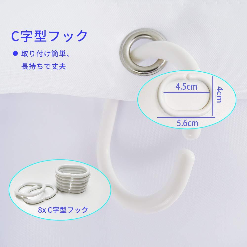 【取り付け簡単】シャワーカーテンの上部にある銅製ハトメは、錆びにくくて長持ちできる、パッケージ内にC字型のプラスチックフックを8個付き、簡単に取り付けられる。