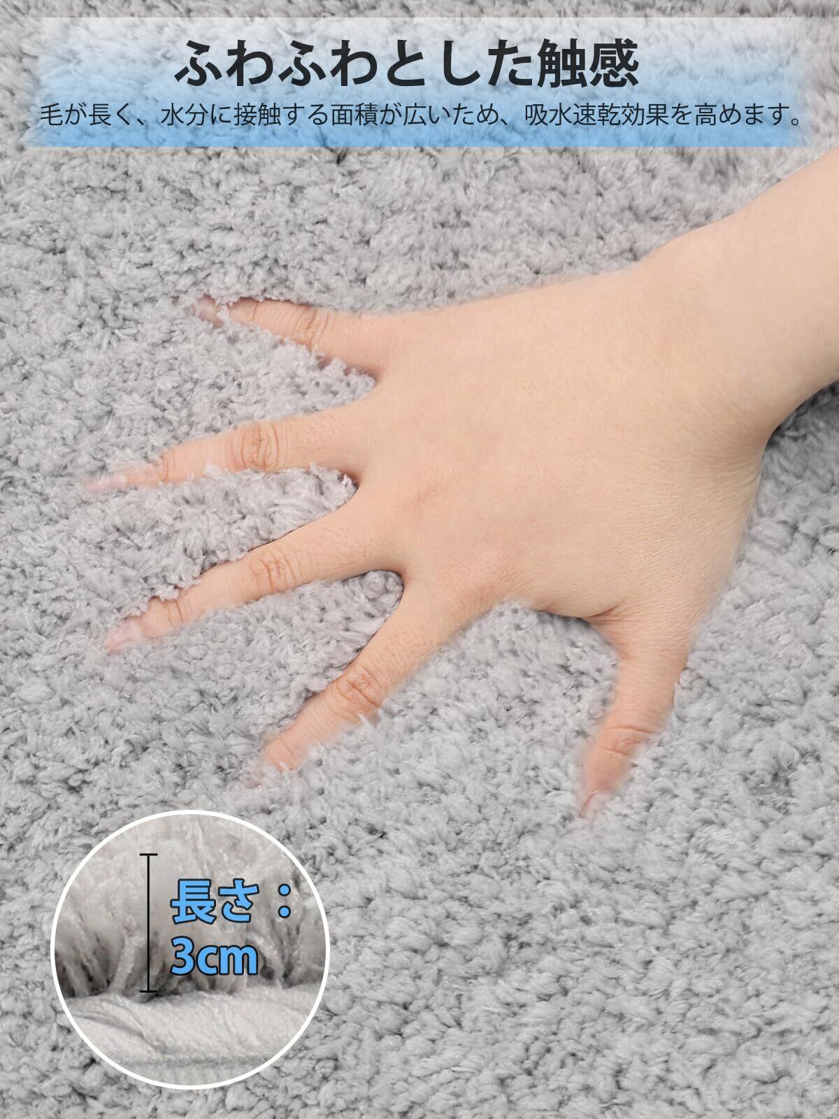 【超厚3cmのふわふわ肌触り】このバスマットは高密度マイクロファイバー素材と約3cmの長毛構造で足裏を包み込み、浴室の水分を瞬時に吸収するとともに冬場の冷たい床面から足元を保護し、高級ホテルレベルの快適性を実現しています。洗濯後も毛足が崩れない耐久性設計により、長期間にわたってふかふかの使用感を維持できる点も特徴です。