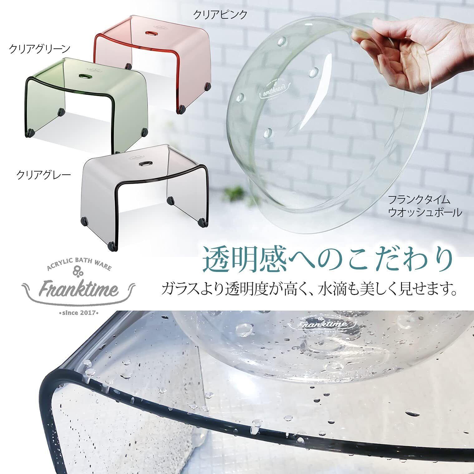 ●バスルームを広く開放的に見せてくれる、透明度の高いアクリル素材を使用したバスチェア