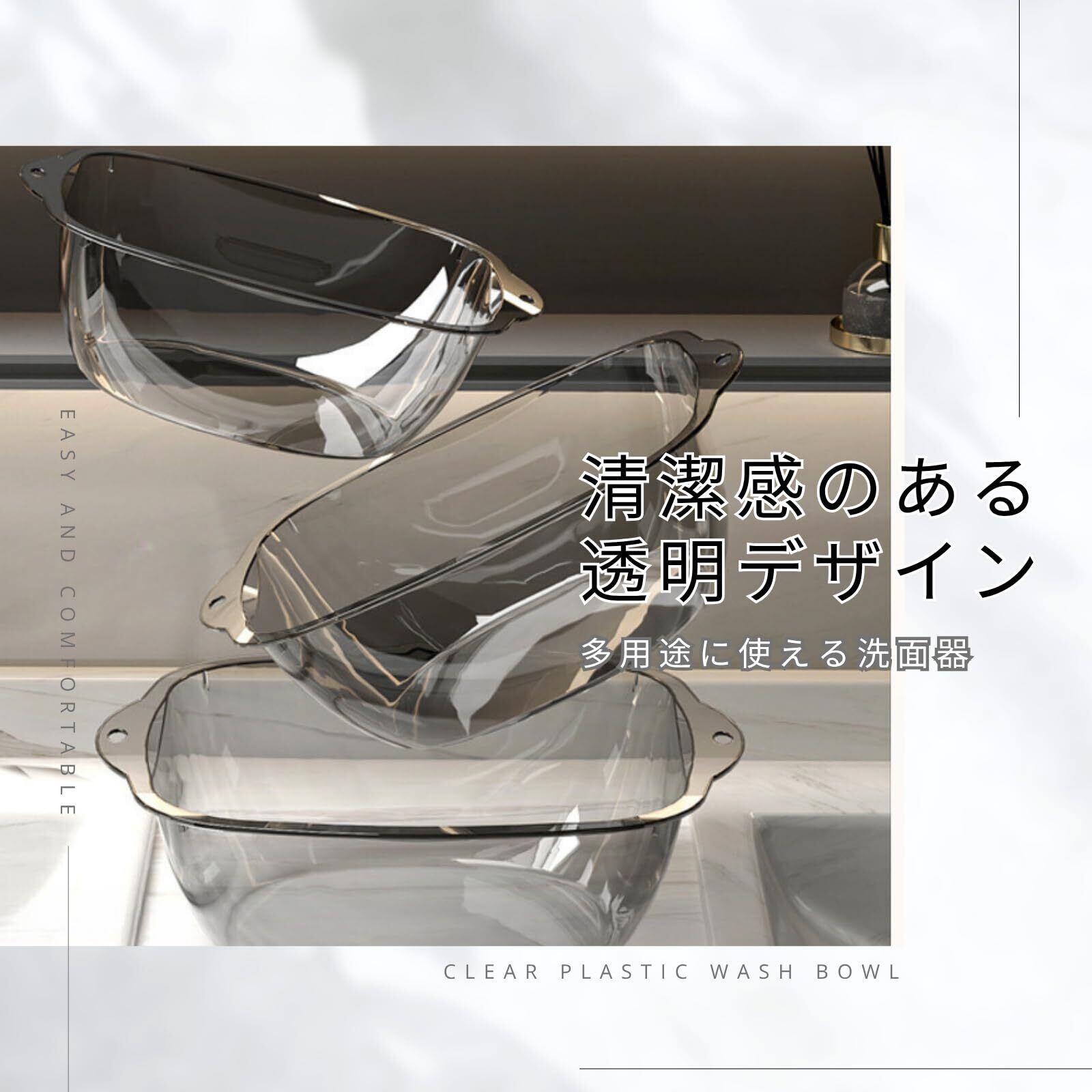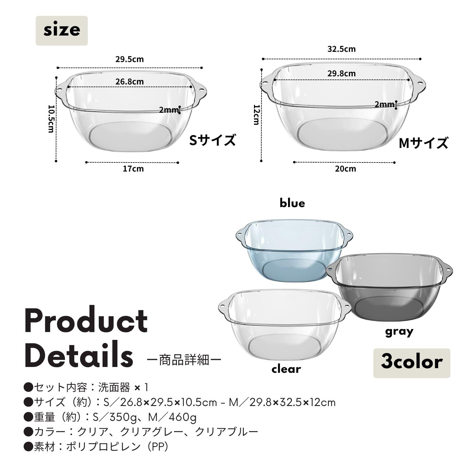 【商品詳細】 セット内容:洗面器 × 1 サイズ(約):S/26.8×29.5×10.5cm、M/29.8×32.5×12cm 重量(約):S/350g、M/460g 素材:ポリプロピレン(PP) カラー:クリア、クリアグレー、クリアブルー