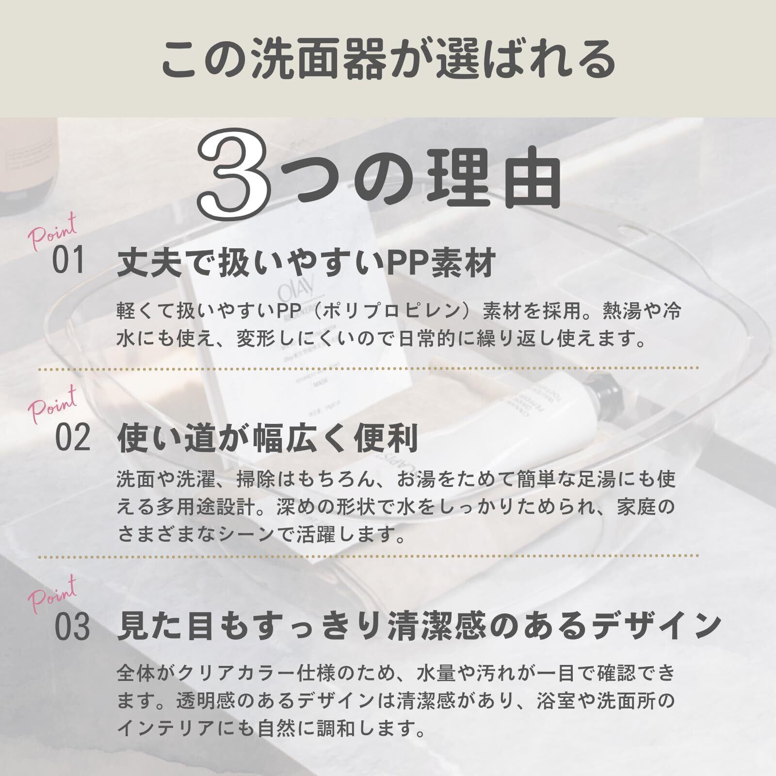 【幅広い用途に対応】 洗面や洗濯、掃除用としてはもちろん、お湯を溜めて簡単な足湯にも活用できます。底が深めの設計で、水をたっぷり入れたい場面にも便利です。家庭内のあらゆるシーンで役立ちます。