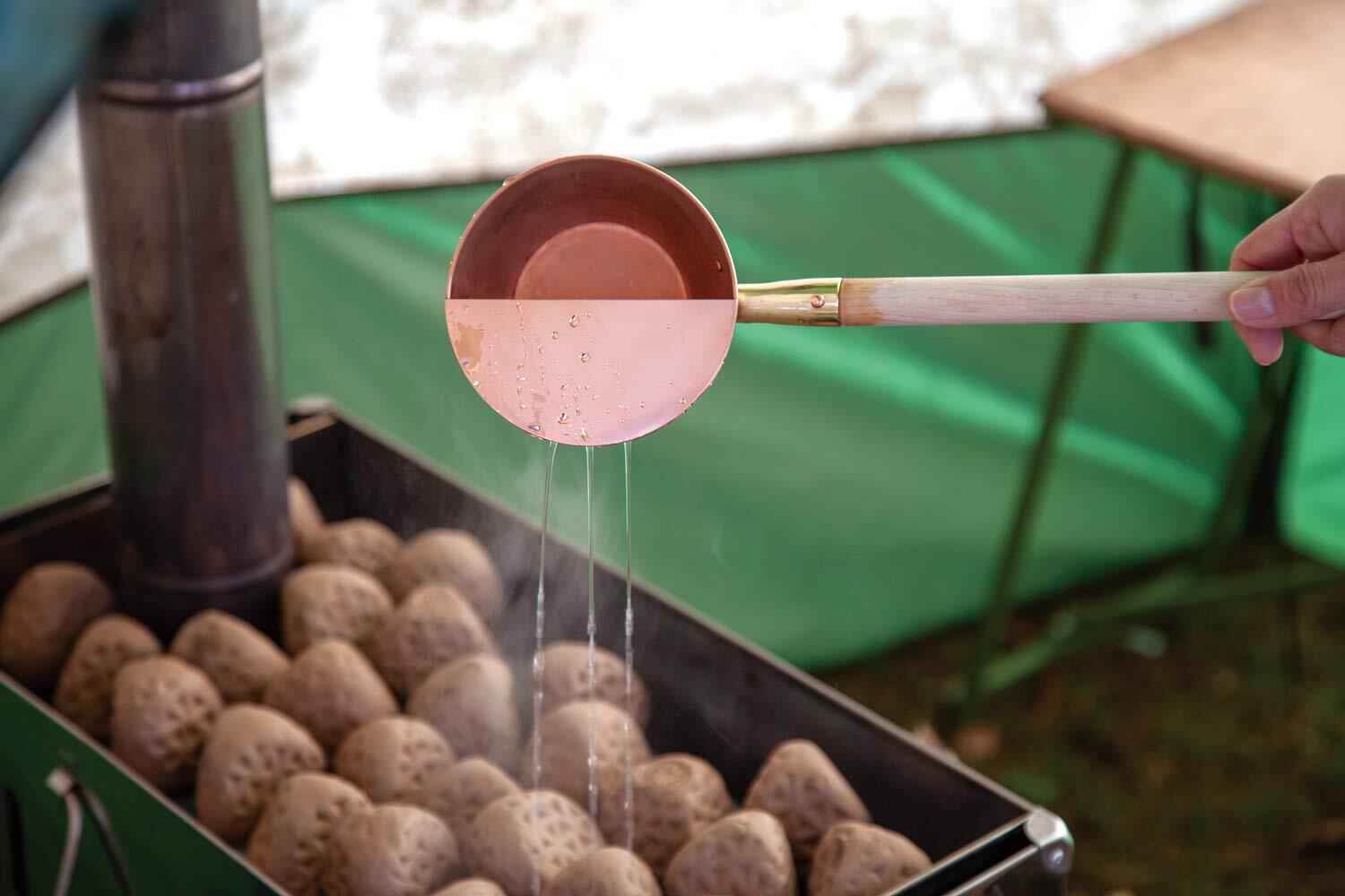 ■五感で感じるロウリュは耳からも楽しむべし パチィ、パチッ、ジュウ、ジュワ〜! ひしゃく側面の3つの穴から、3本の美しい線を描いて水が流れ落ち、心地よい音とともにサウナストーンに当たります。
