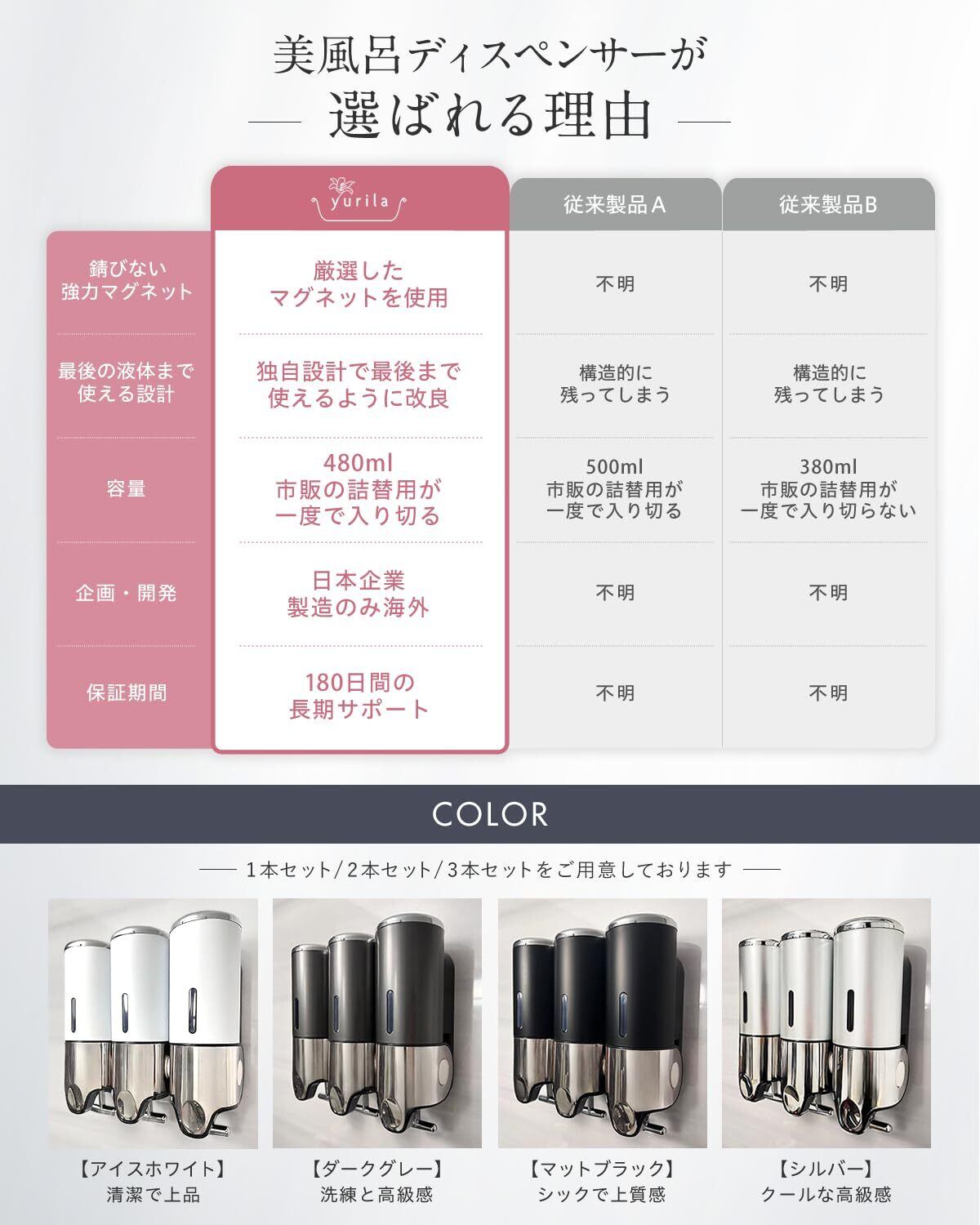 【特価商品】シャンプーディスペンサー マグネット ディスペンサー シャンプーボトル 大容量 強力 おしゃれ 壁掛け 日本企業独自開発 yurila (シルバー, 3本セット)
