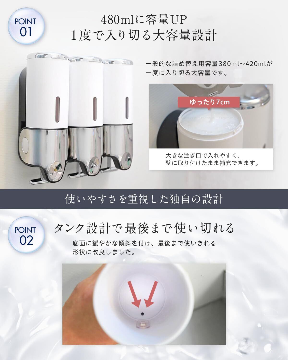 【日本企業独自開発】当店独自の形状により、バスルームを"スッキリ彩る"シャンプーディスペンサー