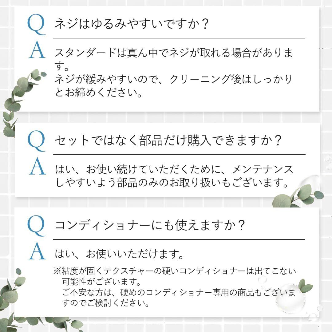ポンプを取り付け、ホルダーに差し込み、吊るすだけ! シャンプーボトルいらずで浴室がスッキリ! より ボトルいらずでバスルームがスッキリ 専用のシャワーラックアームに引掛けて使うので、 シャンプーボトルいらずで浴室がスッキリ! ボトルへの詰替えが不要で着脱はワンタッチ 詰替えパックを差し込むだけで簡単にセット ポンプを取り付けた対角をホルダーに差し込み吊るすだけ! シャンプーやリンス、ボディソープの詰替え用に、 ホルダーとポンプをセットするだけで簡単に使える ポンプを押して使いたい分だけ ポンプを押して使いたい分だけ使える お子様といっしょの時など片手で使えるのでとても便利 こんな使い方もできる 専用アーム以外でもタオル掛けなどに引掛けて使うこともできる 別売の「詰替えそのまま ワンセット」「詰替えそのままMINI」を購入すれば、 フックとポンプを追加することもできる