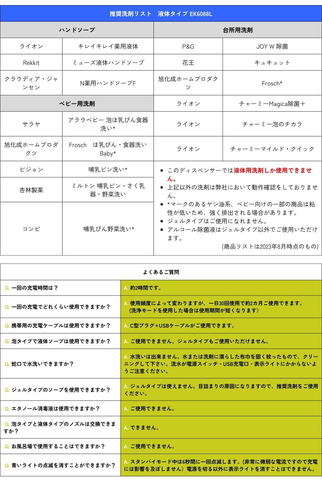 手をかざすと自動で洗剤がでてくるので、本体に触れることがなく衛生的です。泡タイプの洗剤に使用できます。ソープの量は3段階調節でき使用用途に合わせることが出来る優れものです。USB充電式で面倒な電池交換が必要ありません。洗浄機能付きです。