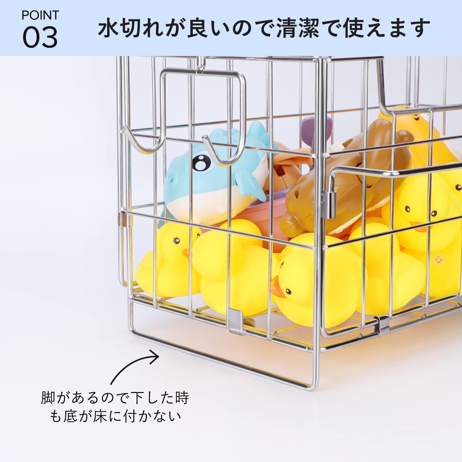 【水切れが良いので清潔です】網状のバスケットだから、バスケットで引っ掛け収納をすることで、シャンプーたお子供様のおもちゃなどのボトルに付着した水分を自然と落としてくれます。水分残りによる水アカヌメリも防ぐことができ衛生的。