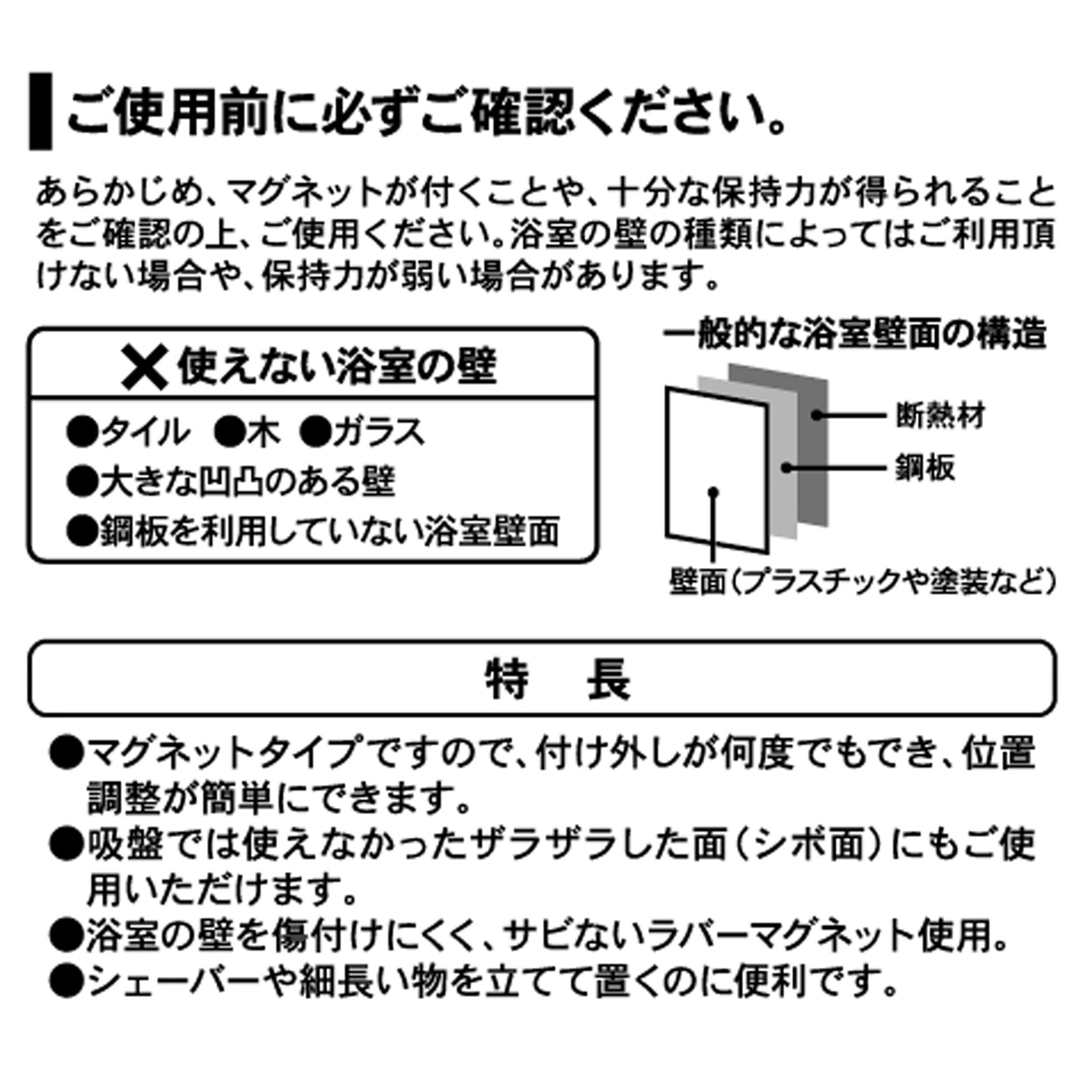 ・浴室の壁を傷付けにくく、サビないラバーマグネット使用