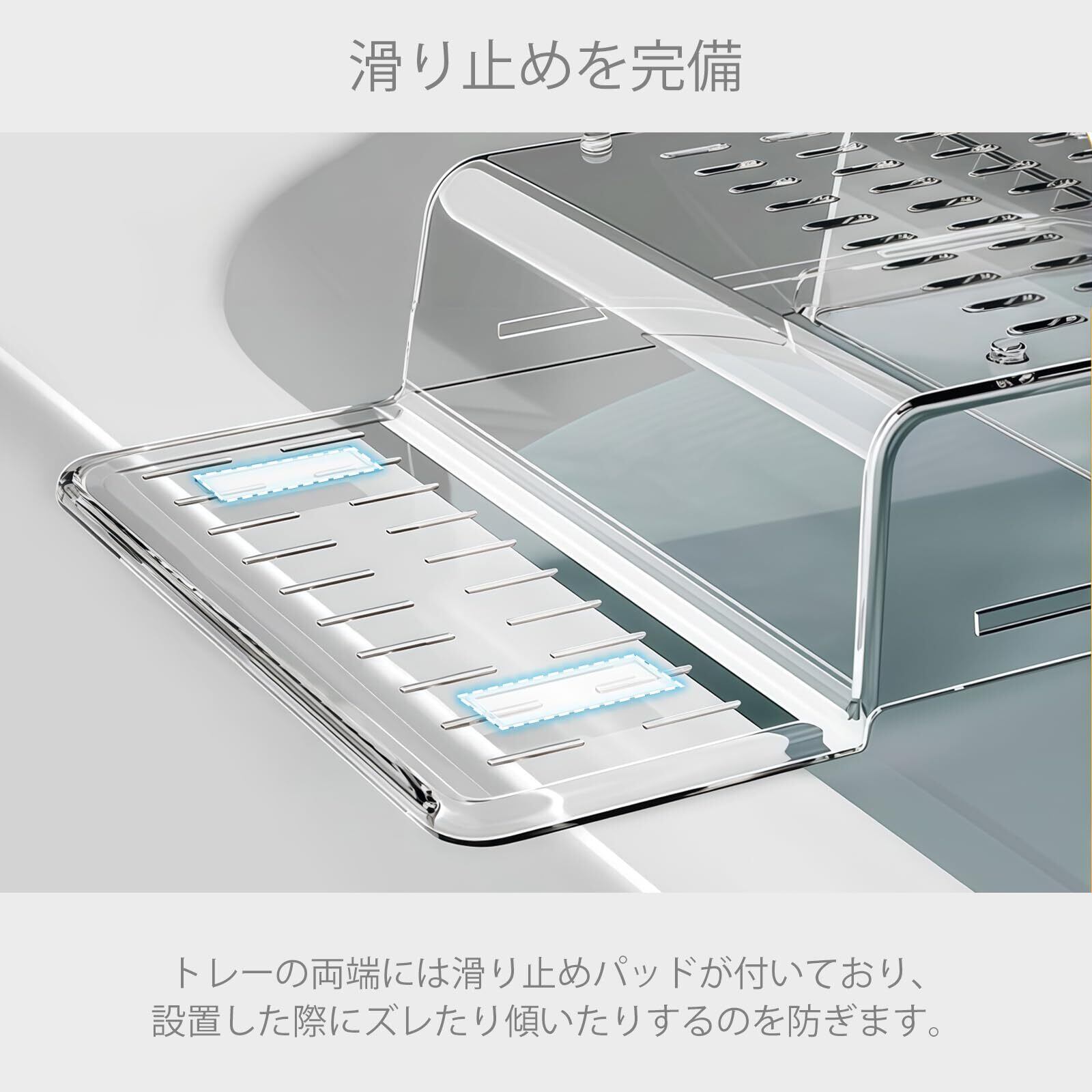 【排水穴付きで衛生的な設計】トレーの底部には排水用のスリットが多数設けられており、水が溜まりにくくなっています。これにより湿気やカビの発生を防ぎ、常に清潔な状態で使用できます。特にバスソルトや石鹸など水分がつきやすいアイテムを置くスペースにも最適。水はけが良いため、使用後の掃除や乾燥も簡単で、長期間衛生的にご使用いただけます。
