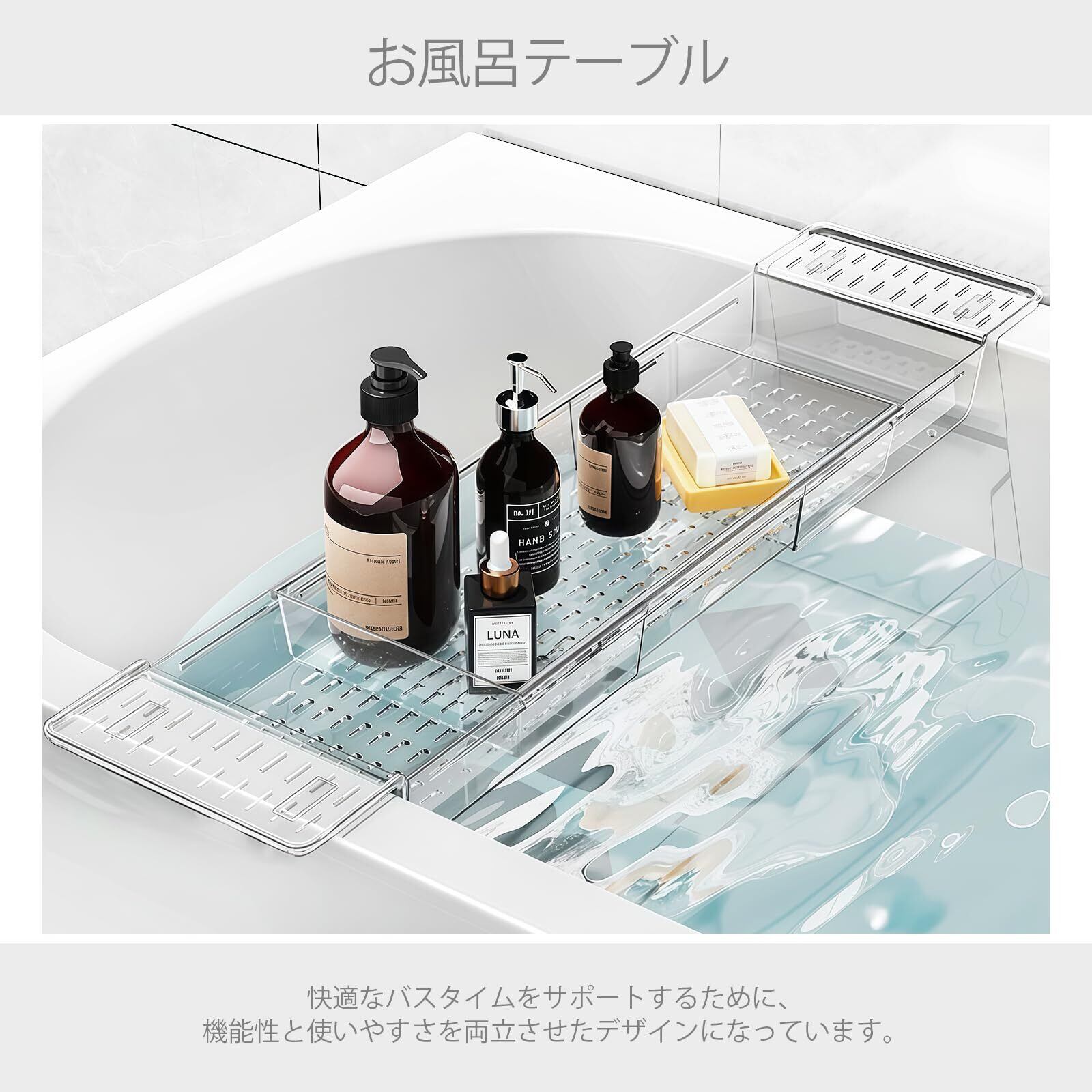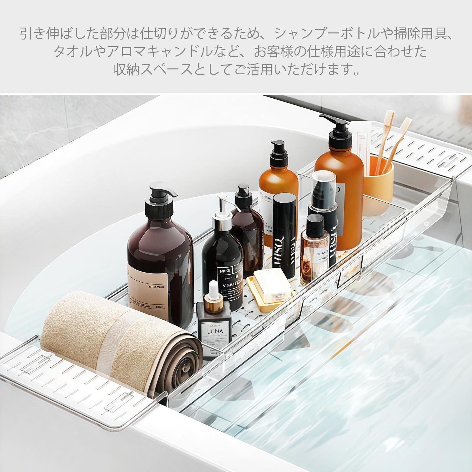 【伸縮式デザイン】伸縮可能な設計を採用しており、さまざまなサイズのバスタブにフィットします。トレーの両端はスライド式で自由に調節可能なため、設置時に無理な力をかけることなく、しっかりと安定して設置できます。引っ越し先や使用環境が変わっても使い続けられるのが大きな魅力です。ご家庭のバスタイムに、もっと自由で快適な収納スペースを提供します。