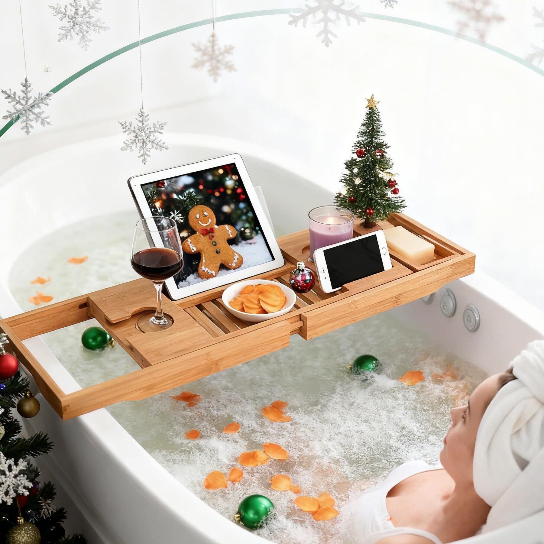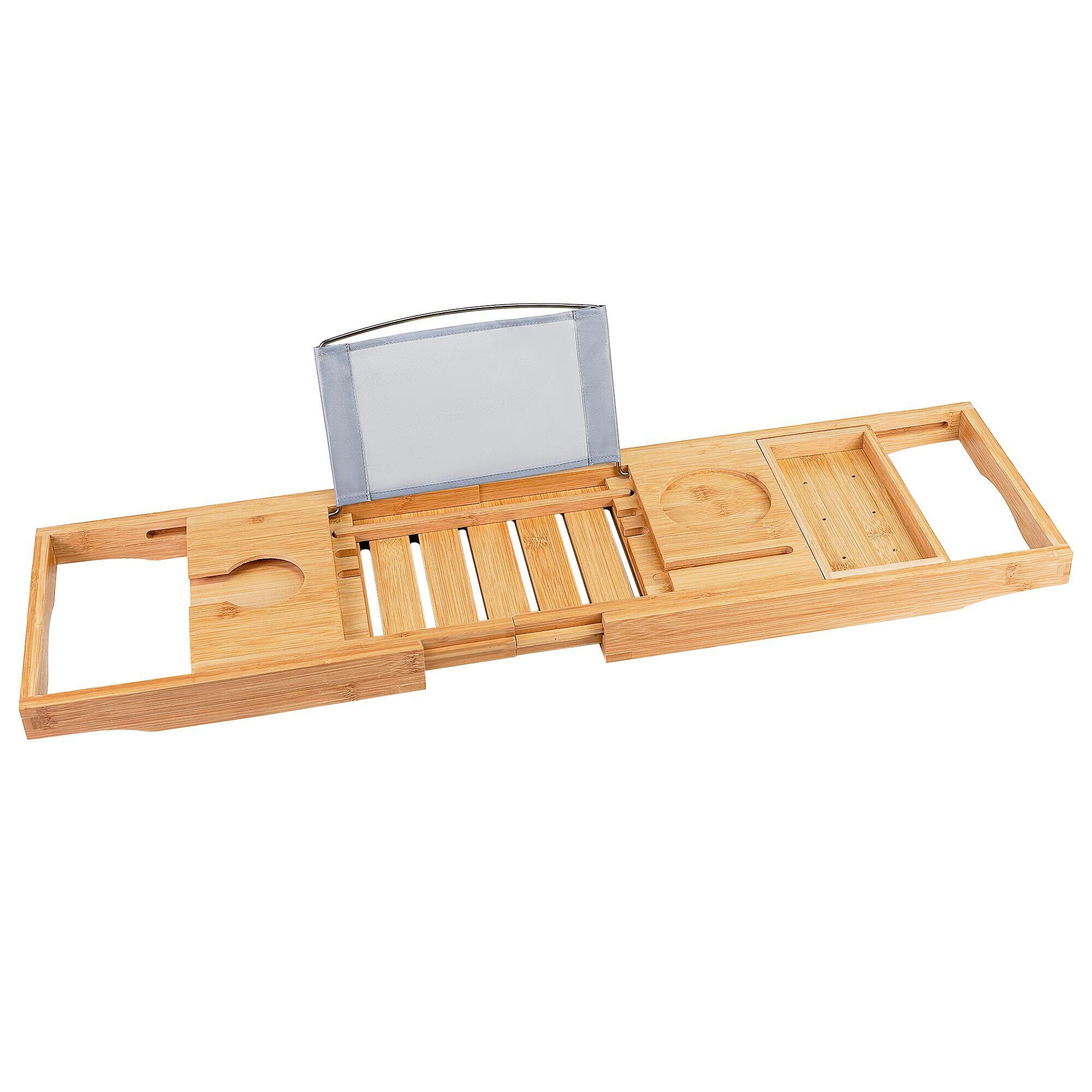 Utoplike バスタブトレー 竹製 バストレー お風呂テーブル 調節可能 バスラック バステーブル お風呂トレイ 携帯 ワイン ホルダー