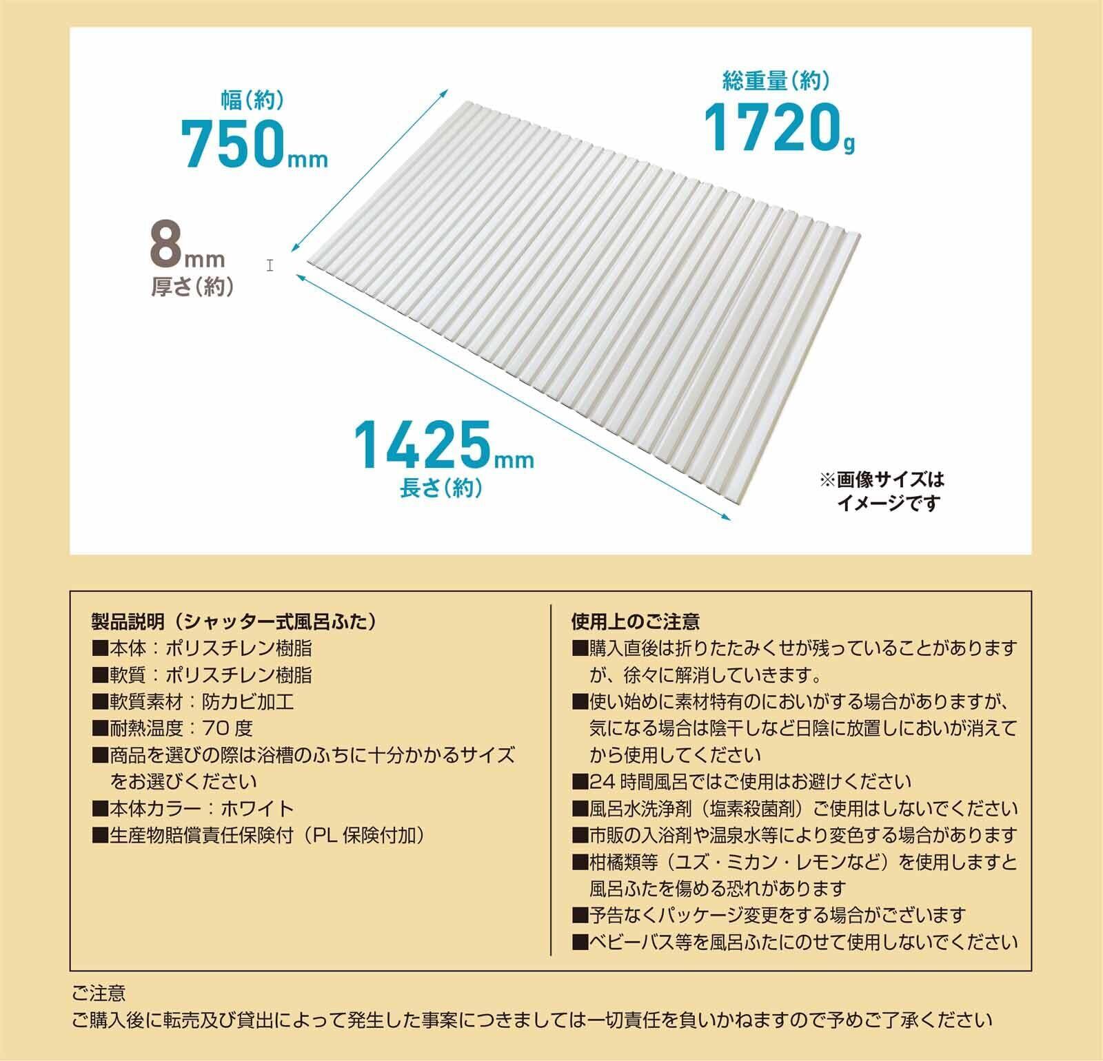 ■製品サイズ : (約)幅 75cm×長さ 142.5cm×厚み 8mm、製品重量 : (約)1720g、耐熱温度 : 70度 ※パッケージ表記のサイズは使用するお風呂の推奨サイズで商品の実寸サイズとは異なります