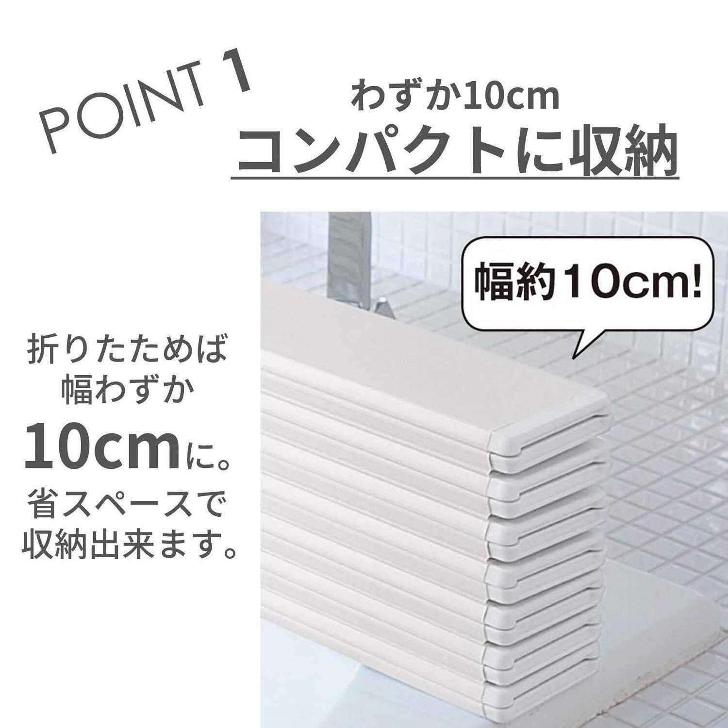 隅々を抗菌加工で清潔に ●毎日使うのに大事な要素が3拍子そろった風呂フタ 【ポイント1】 ●コンパクトに折りたためるので邪魔にならない ●パタパタと折りたたむと、幅はなんと約10cm ●使わない時もスペースを取らずに収納できます 【ポイント2】 ●軽くて扱いやすい ●製品重量はサイズにより1.5~3.2kg ●だいたい2Lのペットボトルを1本持つくらいの感覚で、既にご購入のお客様からも軽い!というお声をいただいています 【ポイント3】 ●カビや菌の繁殖しやすい溝部分を抗菌・防カビ仕様 ●浴室で使うものなので、どうしても気になるカビ ●抗菌・防カビでいつでも清潔、お掃除も楽に