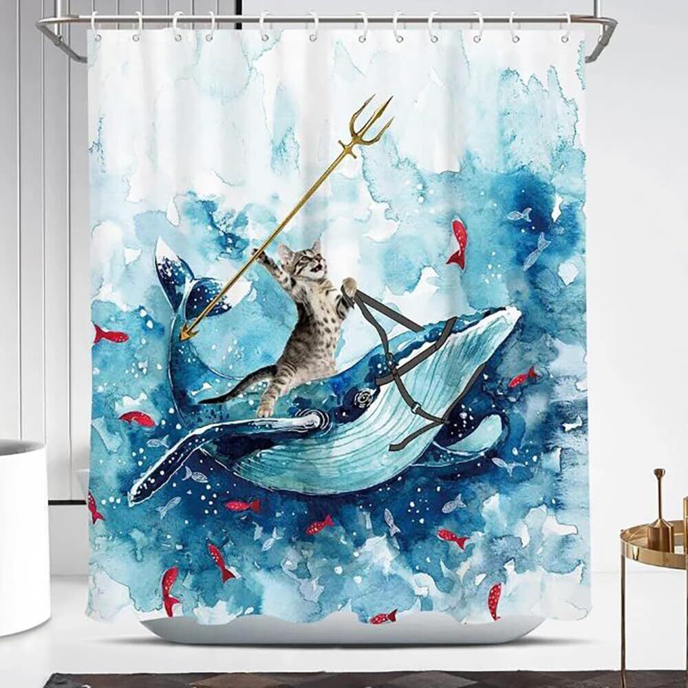 【特価セール】Honesty Mouth シャワーカーテン 防水 防カビ 180丈 猫 可愛い おしゃれ ユニットバス お風呂 バス 浴室 グッズ 小窓 子供部屋 目隠し 間仕切り リング付 (猫くじら, 03:丈180cm×幅150cm)