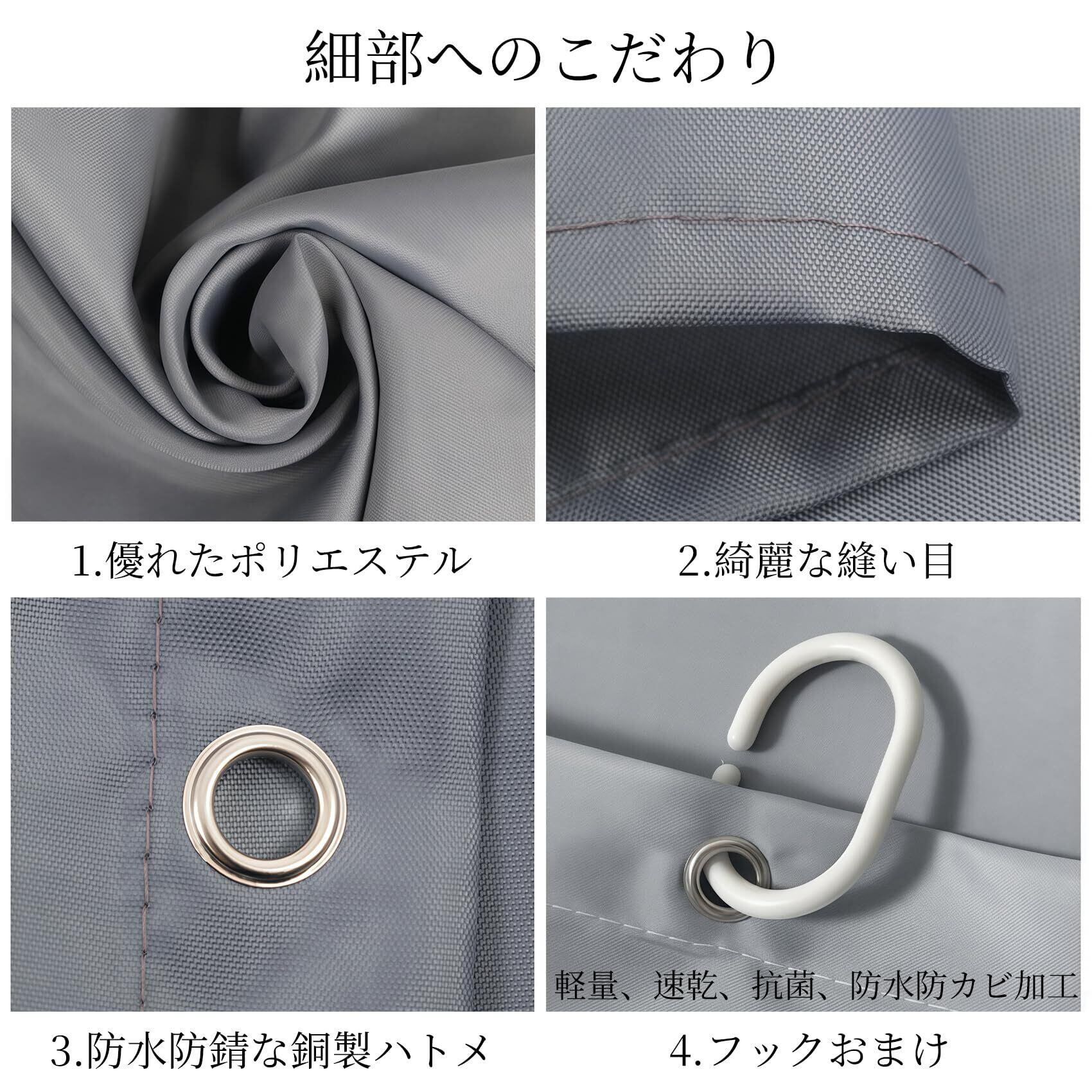 【サイズ展開と調整の自由度】 一般的なシャワールームから大型の浴室まで対応可能な豊富なサイズ展開が特徴です。設置場所に合わせて適切なサイズを選べるため、隙間やたるみを防ぎます。また、商品には調整可能なフックが付属し、幅の調整も可能です。設置時のストレスを軽減し、ぴったりフィットするカーテンで快適な使用感を実現します。