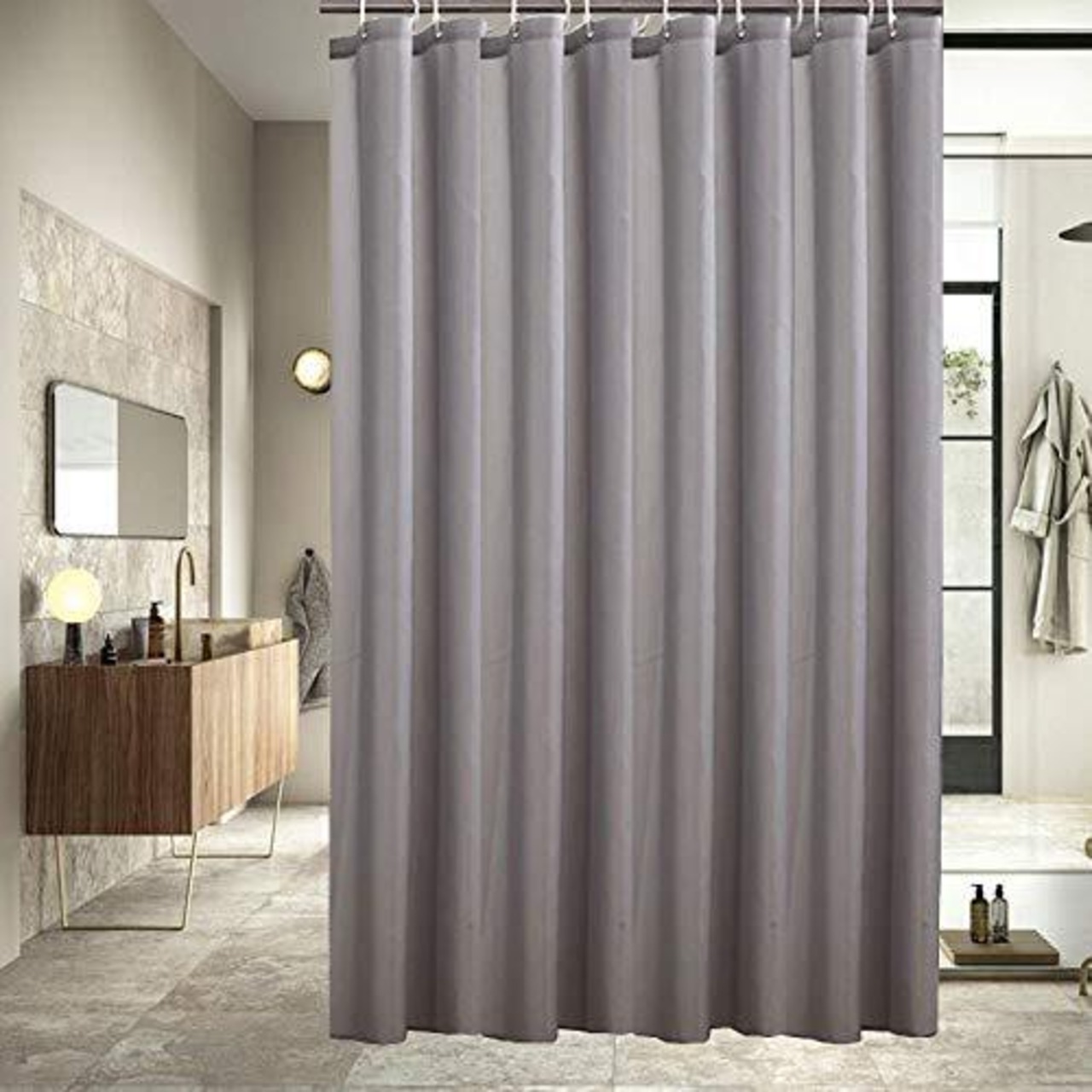 【製品仕様書】:幅120x丈180cm 素材:100%ポリエステル 仕様:防水防カビ シャワーカーテン,パッケージ内容:本体*1+カーテンリング*8,カラー:グレー。