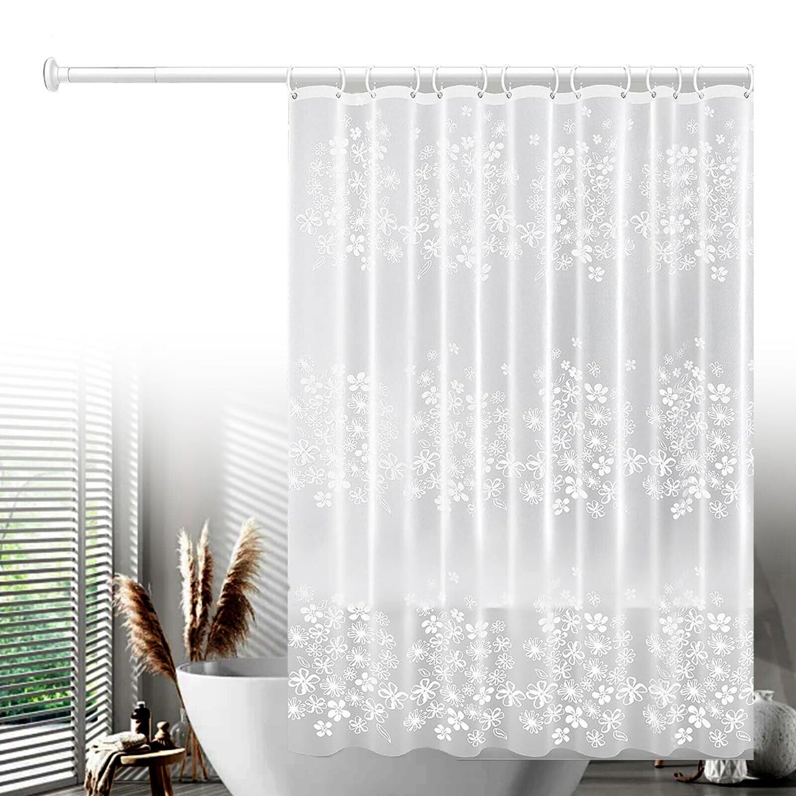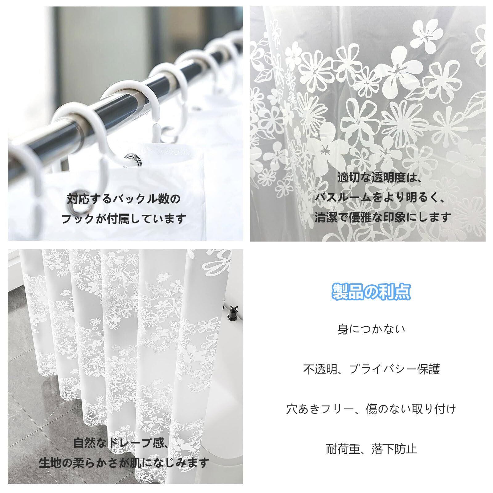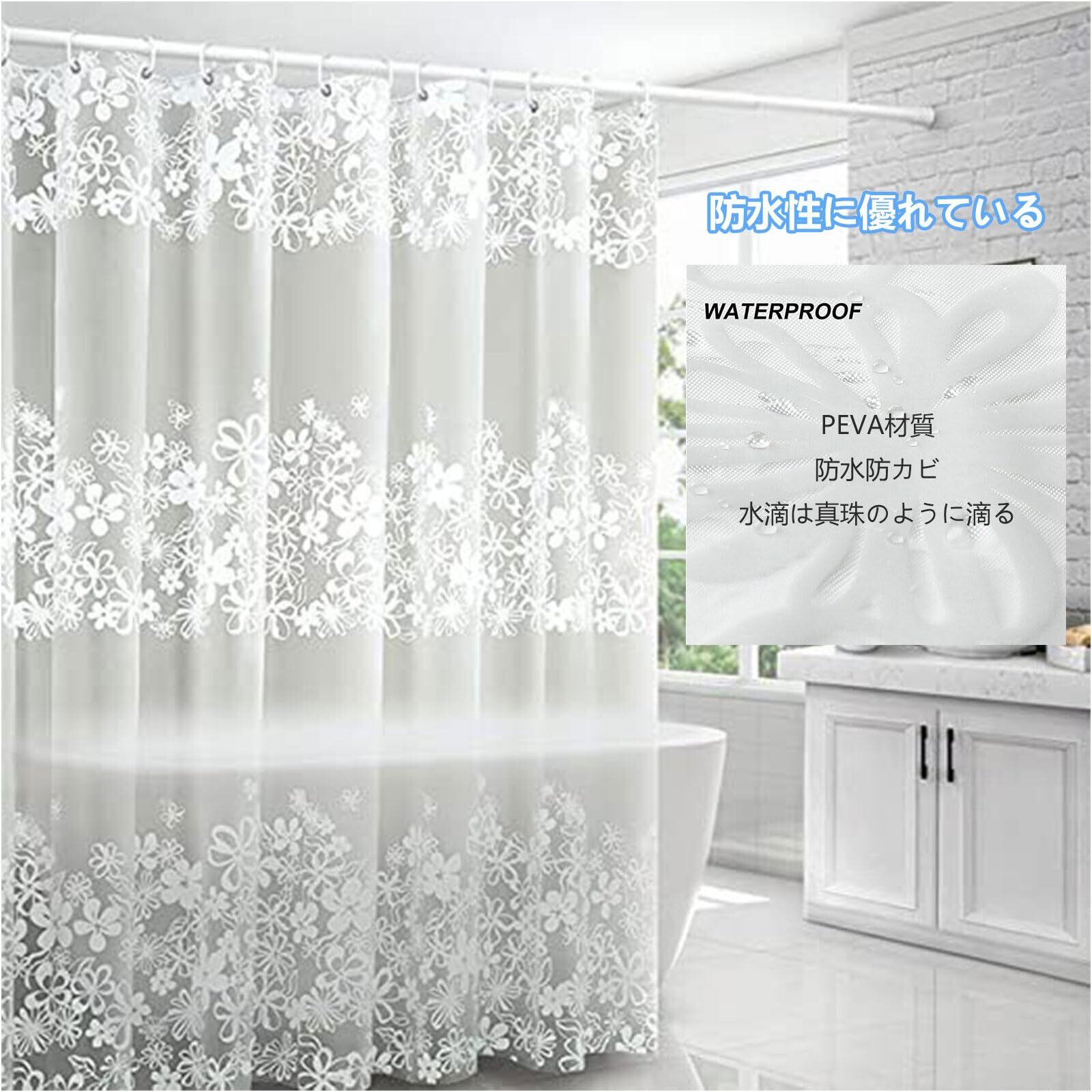 シャワーカーテン 180*200cm シャワー 防カビ ユニットバス カーテン防水 白い花柄 カーテンリング付属 お風呂カーテン 間仕切り プライバシー保護 目隠し 取付簡単 バス用品