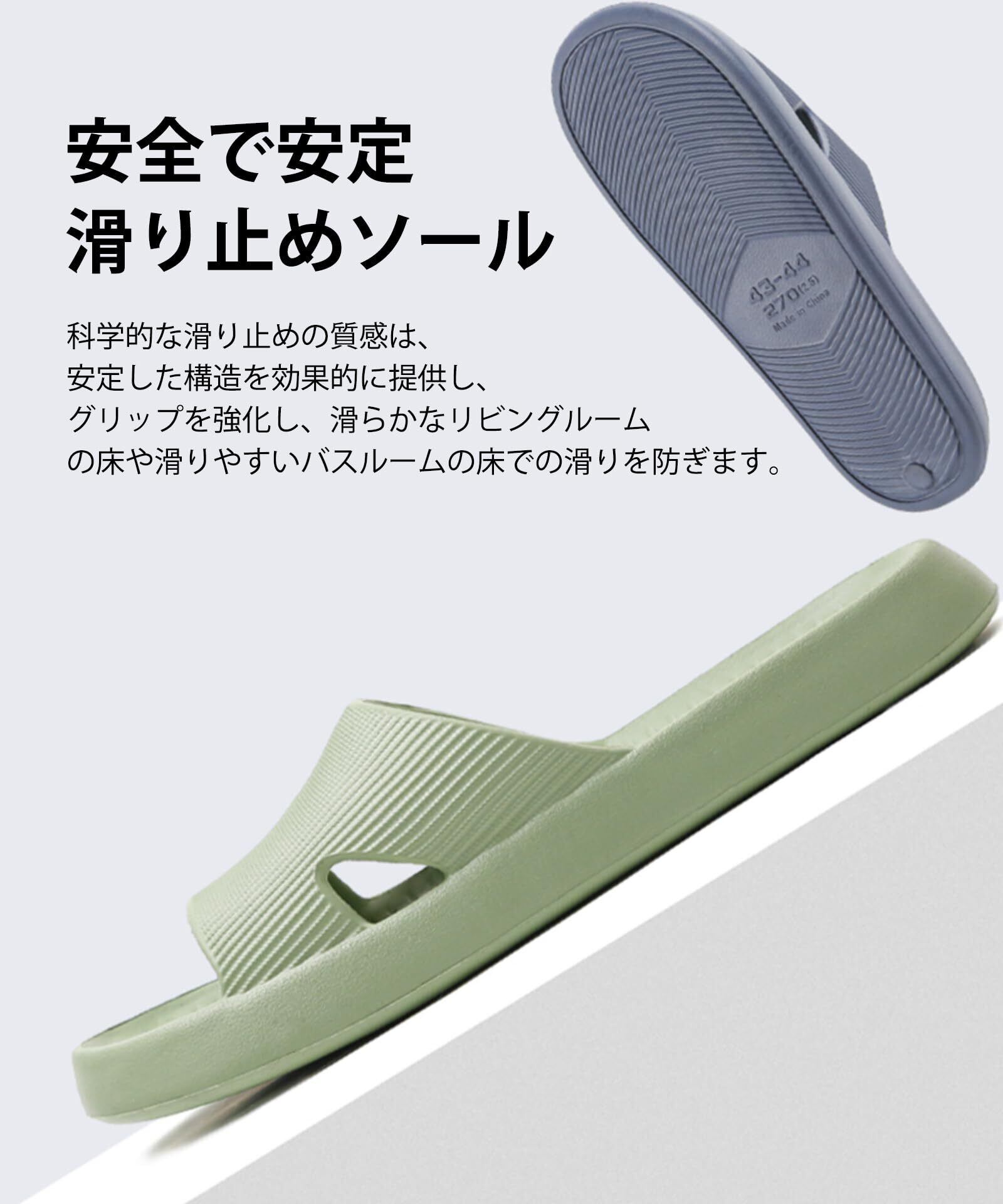 ダブルノンスリップ:当社のシャワースリッパは、滑り止めのソールが優れたグリップを提供し、濡れた環境での事故を防ぎます。スリッパは、安全で安定した摩耗のために、接触面に滑り止めストリップが付くように設計されています。