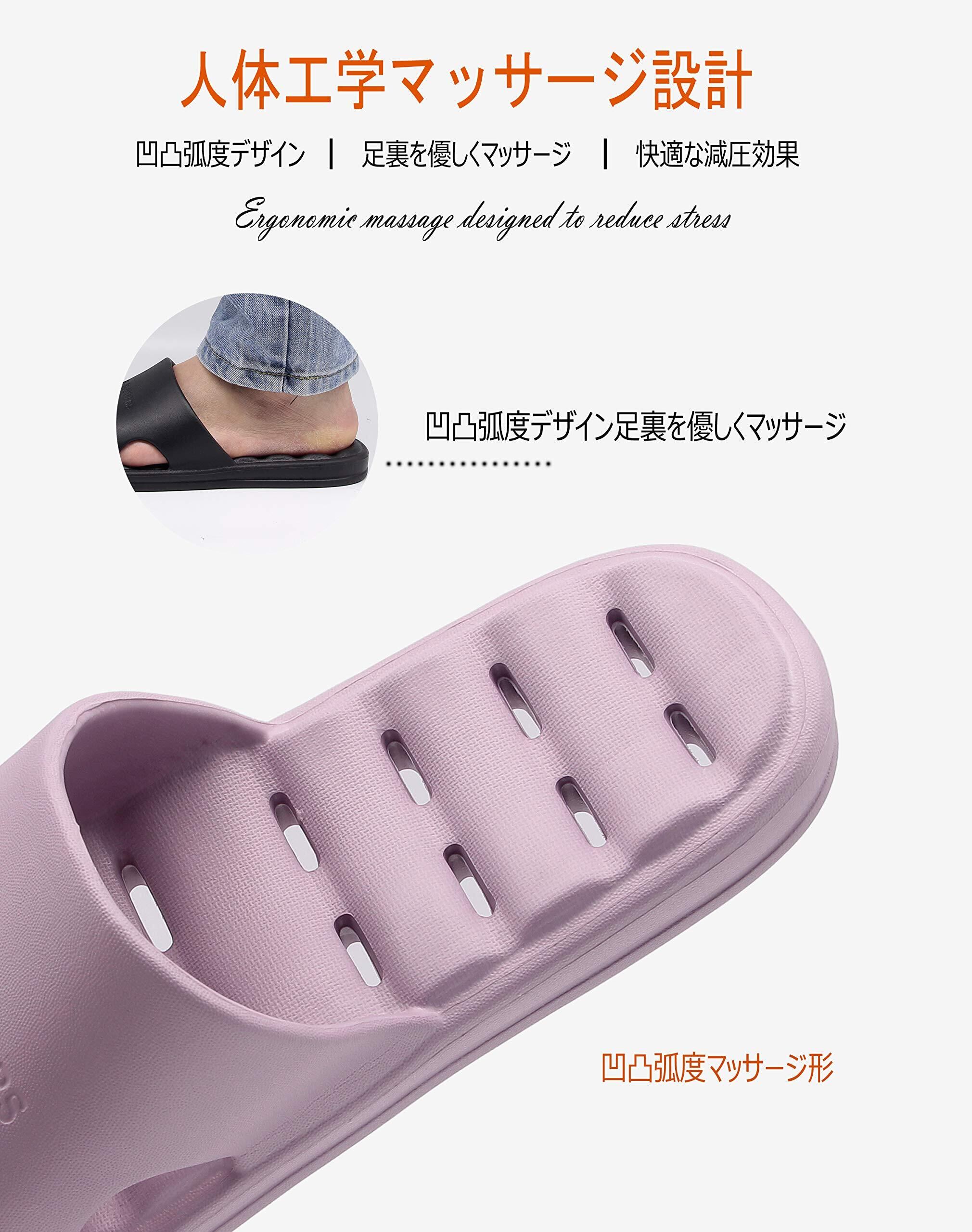 【水切り設計・マッサージ刺激】トイレサンダルのソールは凹凸水切り設計、水がたまっていないから、防臭衛生で、汗によるベタつきを防ぎ、蒸れやすい足元/汗の悩みもサラッと解決です。軽度マッサージ機能を持って、足裏のツボ押し刺激を自然な形でおこなうことが出来るので、長時間使用しても疲れにくいです。