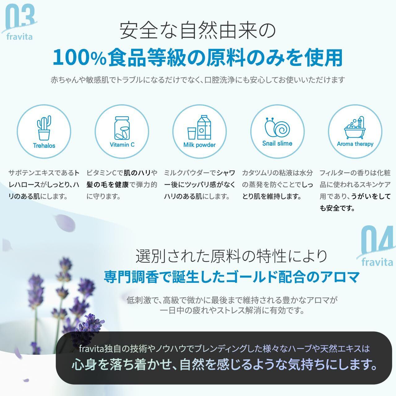 【選べるアロマ香料】 ラベンダー、ジャスミン、チェリーブロッサムなどの香りが、毎日のシャワーをリラックスタイムに変えます。