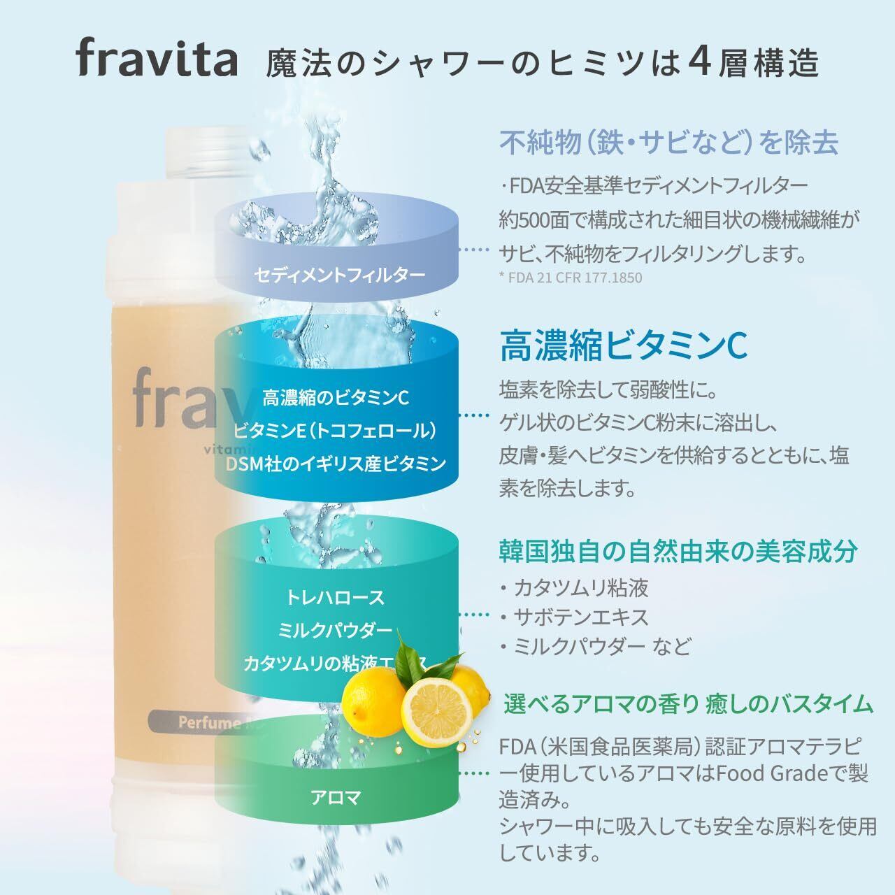 【4層フィルター構造】 セディメントフィルターで不純物を除去し、高濃縮ビタミンCやトレハロース、天然美容成分をしっかり届けます。敏感肌・赤ちゃんでも使えるやさしさ。