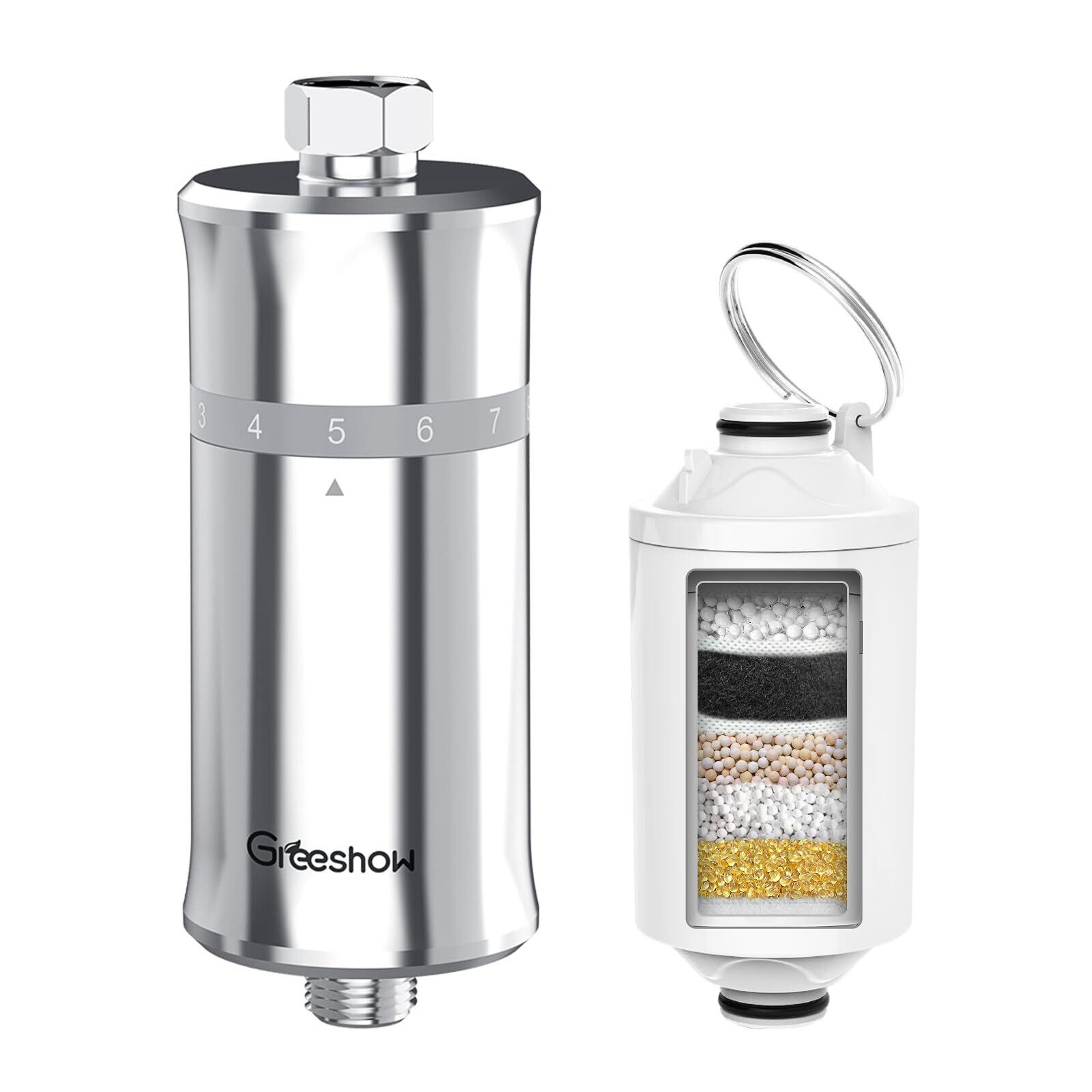 Greeshow シャワーフィルター 塩素除去 98%以上 シャワーヘッド 浄水器 7段階ろ過 ビタミンC配合 赤ちゃん・敏感肌に カートリッジ1本内蔵 簡単取付 20000L長寿命 (シルバー/G1/2規格)
