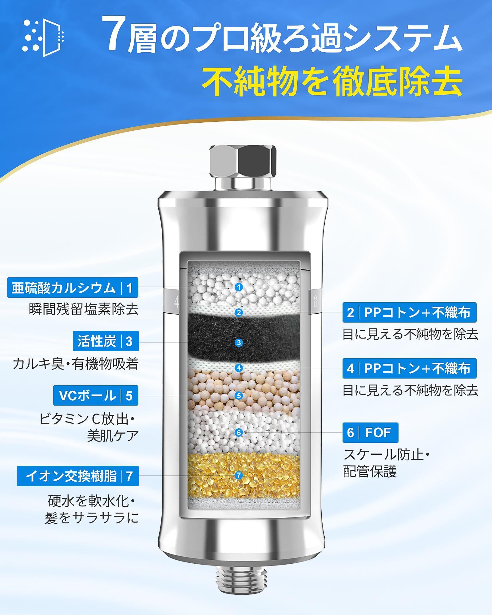【業界トップクラスの7段階ろ過システム】 亜硫酸カルシウム、活性炭、FOF、イオン交換樹脂、不織布などを組み合わせた独自の7層構造を採用。従来のフィルターでは取り切れなかった微細な重金属やサビ、不純物まで逃しません。目に見えない汚れまでしっかりカットし、クリアで清潔な水をお届けします。