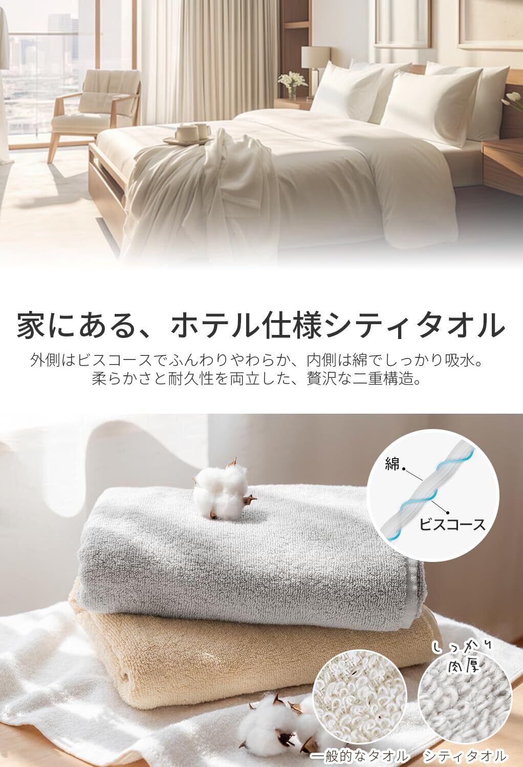 【驚きの吸水力&速乾性|ホテルタオルのような心地よさ】わずか1秒でスッと吸水!AIFYの「シティタオル」フェイスタオルは、繊維の隙間がより細かく、水分を瞬時にキャッチ。高密度パイル構造で、まるでホテルタオルのような“ふわっふわ”の肌触りを実現!厚手なのに軽く、部屋干しでも“さらっと”乾く速乾性。毎日の洗顔やお風呂上がりにぴったりです。