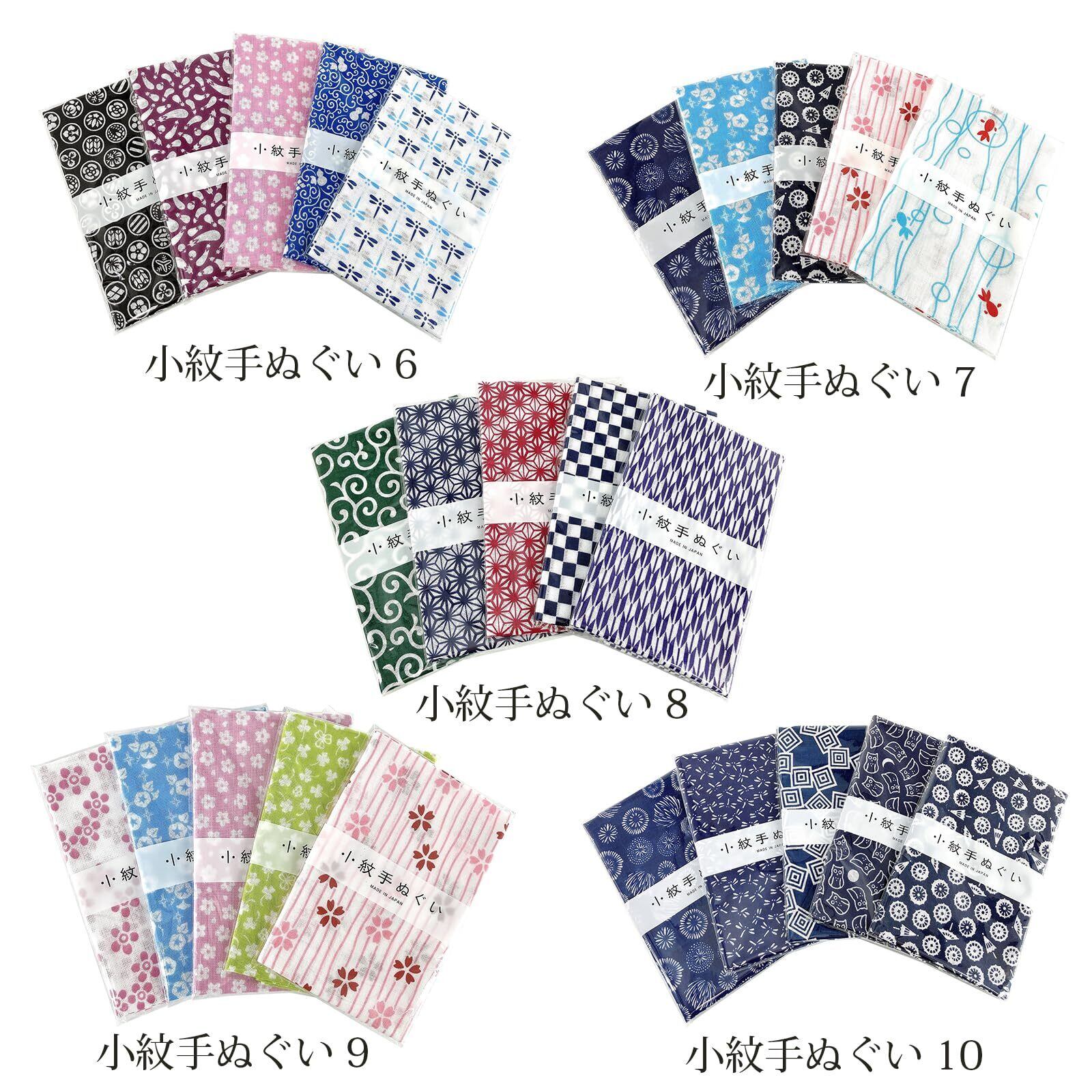 ●裏通しプリントされた小紋柄が5枚セットになった人気の日本製の手ぬぐいです。伝統的な柄から、かわいい柄まで豊富にご用意しております。
