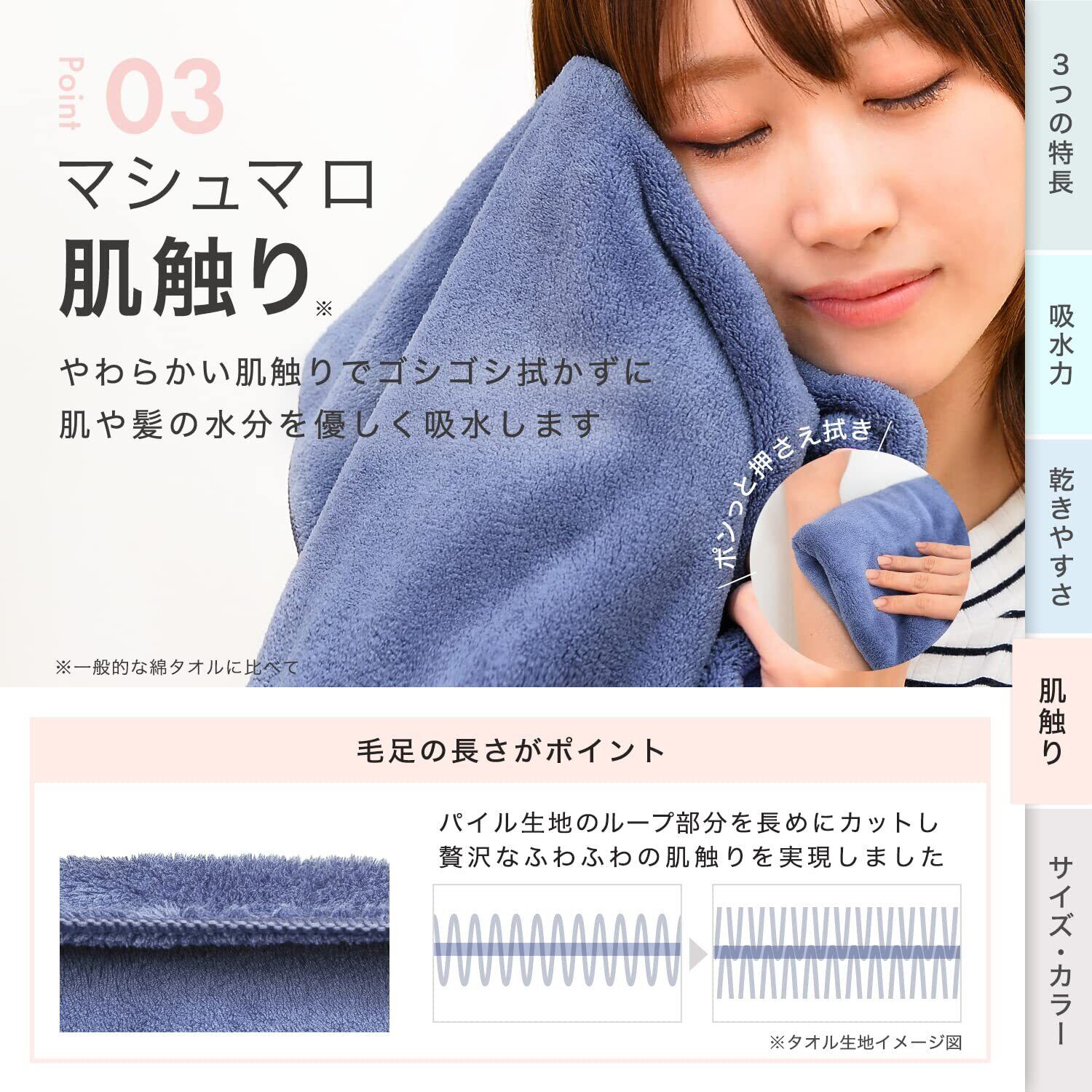 ●柔らかな肌ざわり&抜群の吸水力で、ゴシゴシ拭かなくても肌や髪の水分を優しく・素早く吸い上げます。