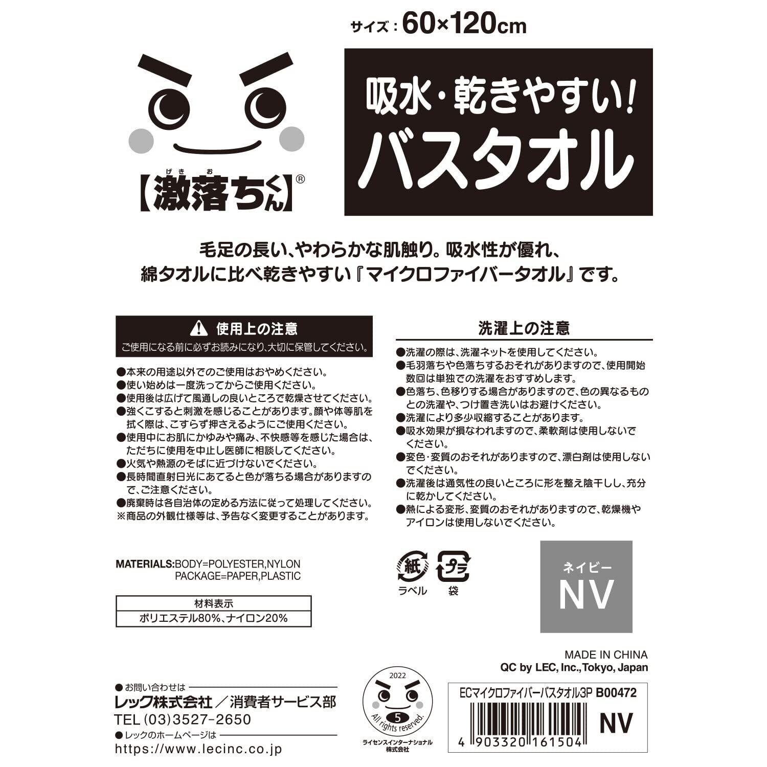 レック 激落ちくん マイクロファイバー バスタオル 3枚入 (ネイビー) 超極細繊維のやわらかい肌ざわり/高い吸水性/濡れても乾きやすい /