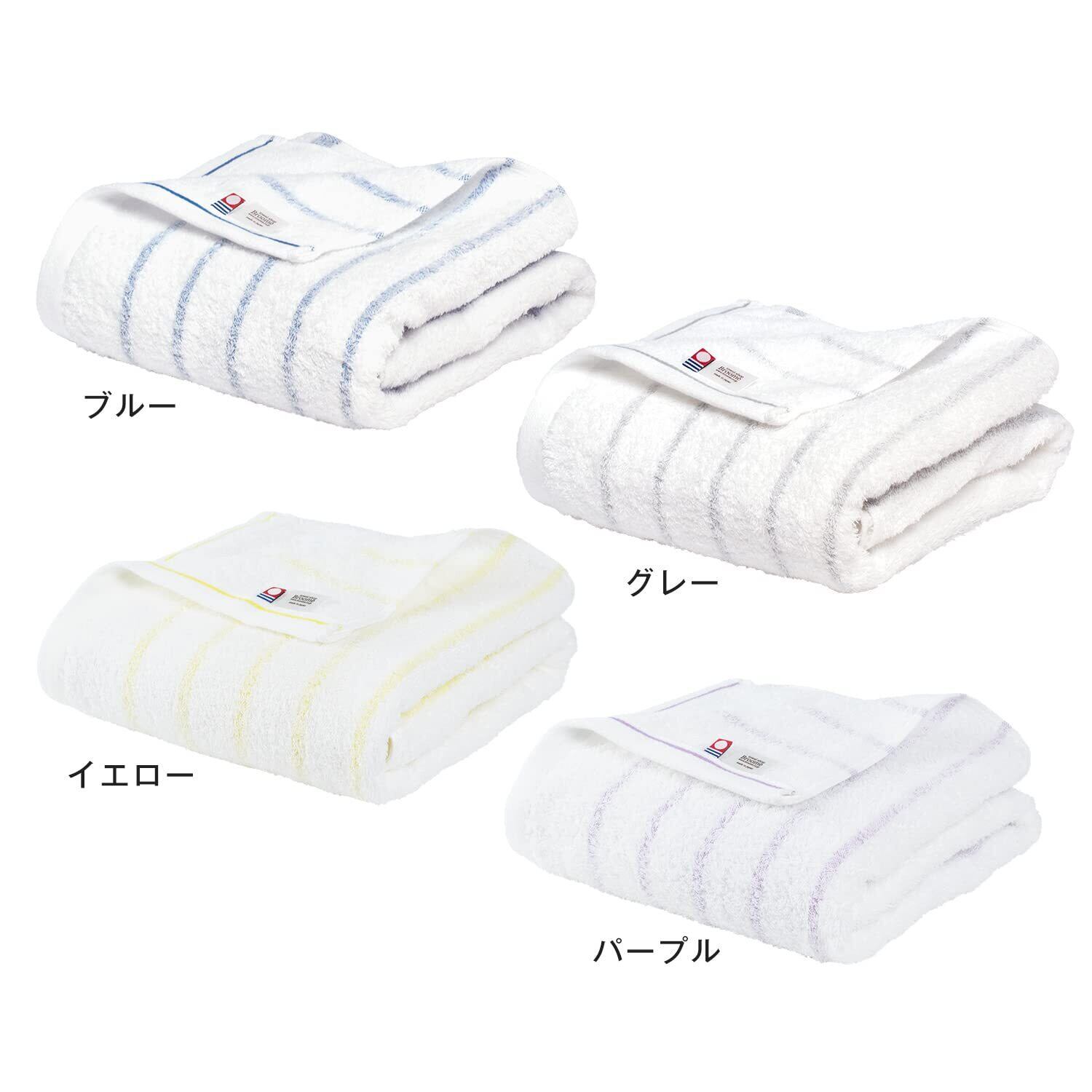 【バスタオル 2枚セット】サイズ:約65×125cm、250g、綿100%、日本製(今治)。人気のボーダー柄で、カラーは全4色(ブルー・グレー・イエロー・パープル)。