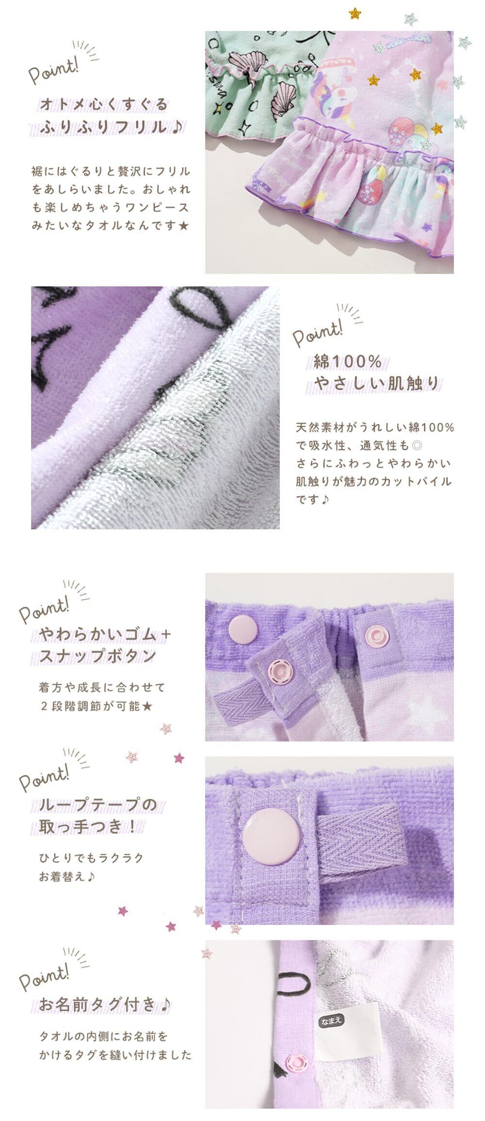【在庫セール】ラップタオル キッズ 女の子 巻きタオル 子供 貝殻柄 フリル ワンピース風 ユニコーンLavender 70cm丈