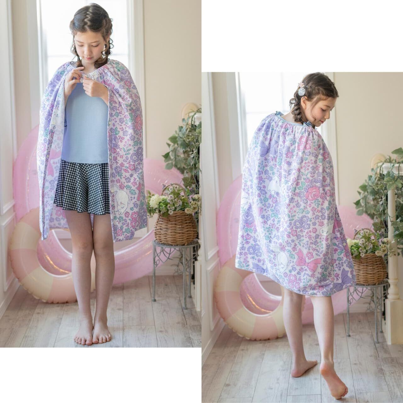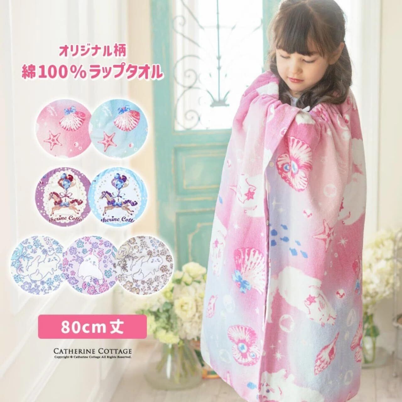 夢見るキュート柄!女子力高めなプールタオルキャサリンコテージデザイナーが描き出した、キュートな世界観が魅力の大判ラップタオル!キッズからジュニアの女の子まで、学校プールやビーチでかわいく使えるデザインです。水着のお着替えにはもちろん、プールサイドやビーチでの休憩、冷え対策、日差し対策に!DETAIL01:ふわふわした触り心地がとっても気持ちいい綿100%なので吸水性もばつぐん◎02:お子さまがひとりでもスナップを取り外ししやすいよう、胸元に取っ手をつけています03:2段階でサイズ調整ができるボタン付き。ぴったりサイズで長くお使いいただけます。04:洗濯表示タグに名前を書く欄を設けましたこんなシーンにもどうぞ:・ビーチサイドでの休憩に・体操やバレエなど習い事のお着替えに・お風呂上がりのひとときに※商品の素材や色合いなど、生産時期によって差異が生じます。※カラーの違いについて末尾にJが付いているカラーと付いていないカラーがある場合がありますが、生産時期により選択肢が分かれています。どちらをお選び頂いてもデザインに違いはなく、同じ商品です。【素材】綿100%【商品仕様】原産国:中国伸縮性:なし生地の厚み:普通サイズ感:普通[型番:GT001]