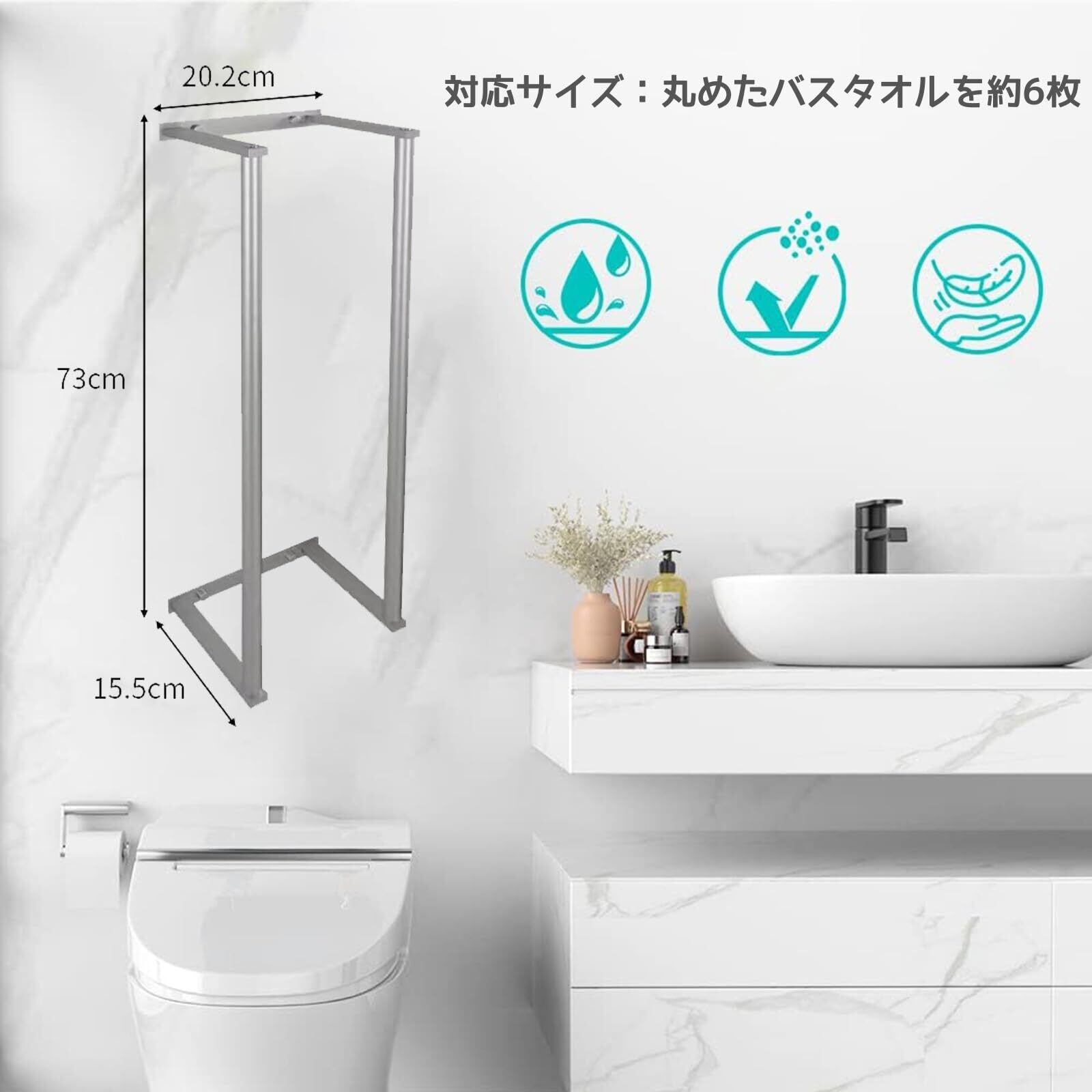 【様々なシーンで活躍】このタオル収納ラックのサイズは73x20.2x15.5cmで、毎日のニーズを満たすのに十分な容量です。タオルラックがあるお風呂場・洗面所・トイレなど様々な場所で活用できます。水バスタオルを丸めて壁面にすっきり収納できます。
