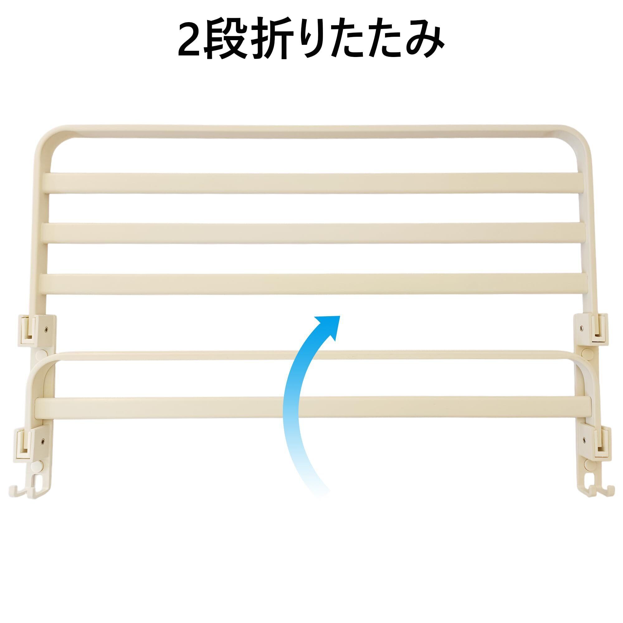 サイズ(展開時):幅60×奥行21.5×高さ17.2cm サイズ(折畳み時):幅60×奥行2.5×高さ36cm 商品重量:660g カラー:スクリームホワイト 素材:アルミ 仕様:2段折畳み、両端フック 取り付け方法:粘着式、ネジ式