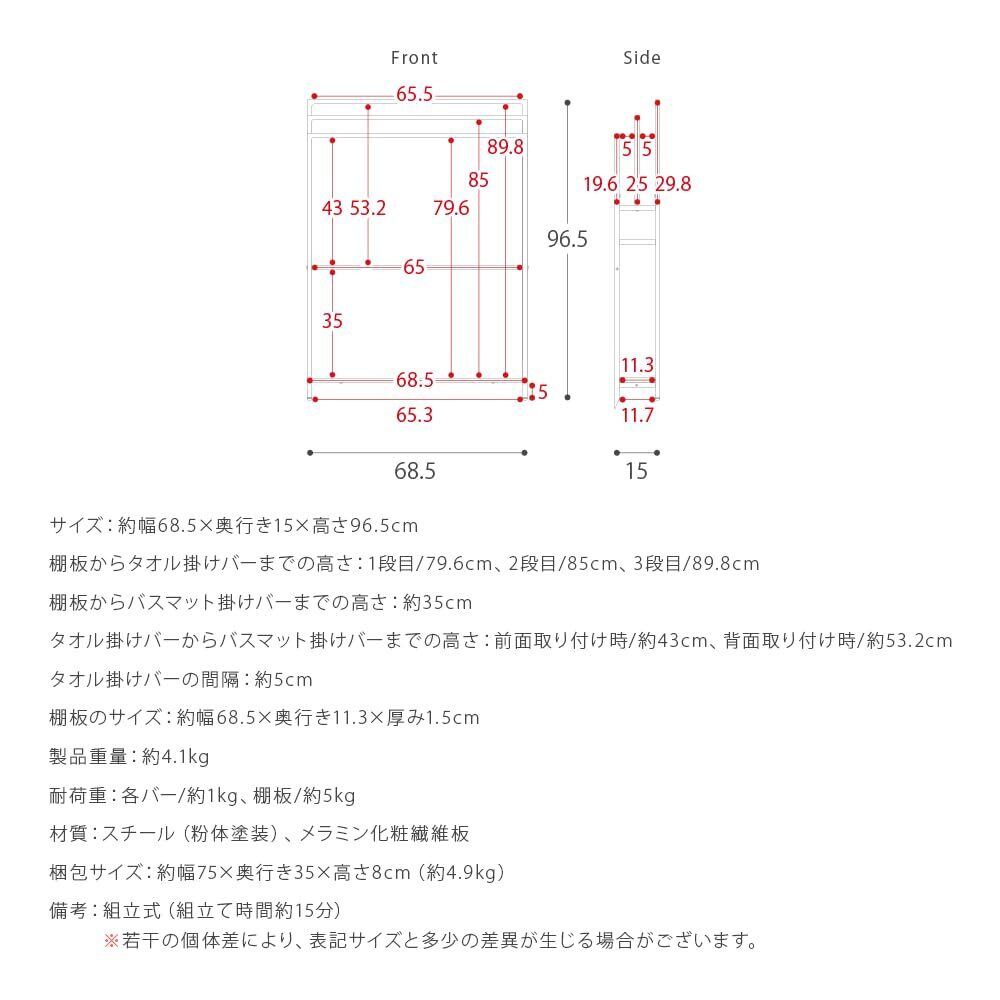 【サイズ】約幅68.5×奥行き15×高さ96.5cm 【棚板からタオル掛けバーまでの高さ】1段目/79.6cm、2段目/85cm、3段目/89.8cm 【棚板からバスマット掛けバーまでの高さ】約35cm 【タオル掛けバーからバスマット掛けバーまでの高さ】前面取り付け時/約43cm、背面取り付け時/約53.2cm
