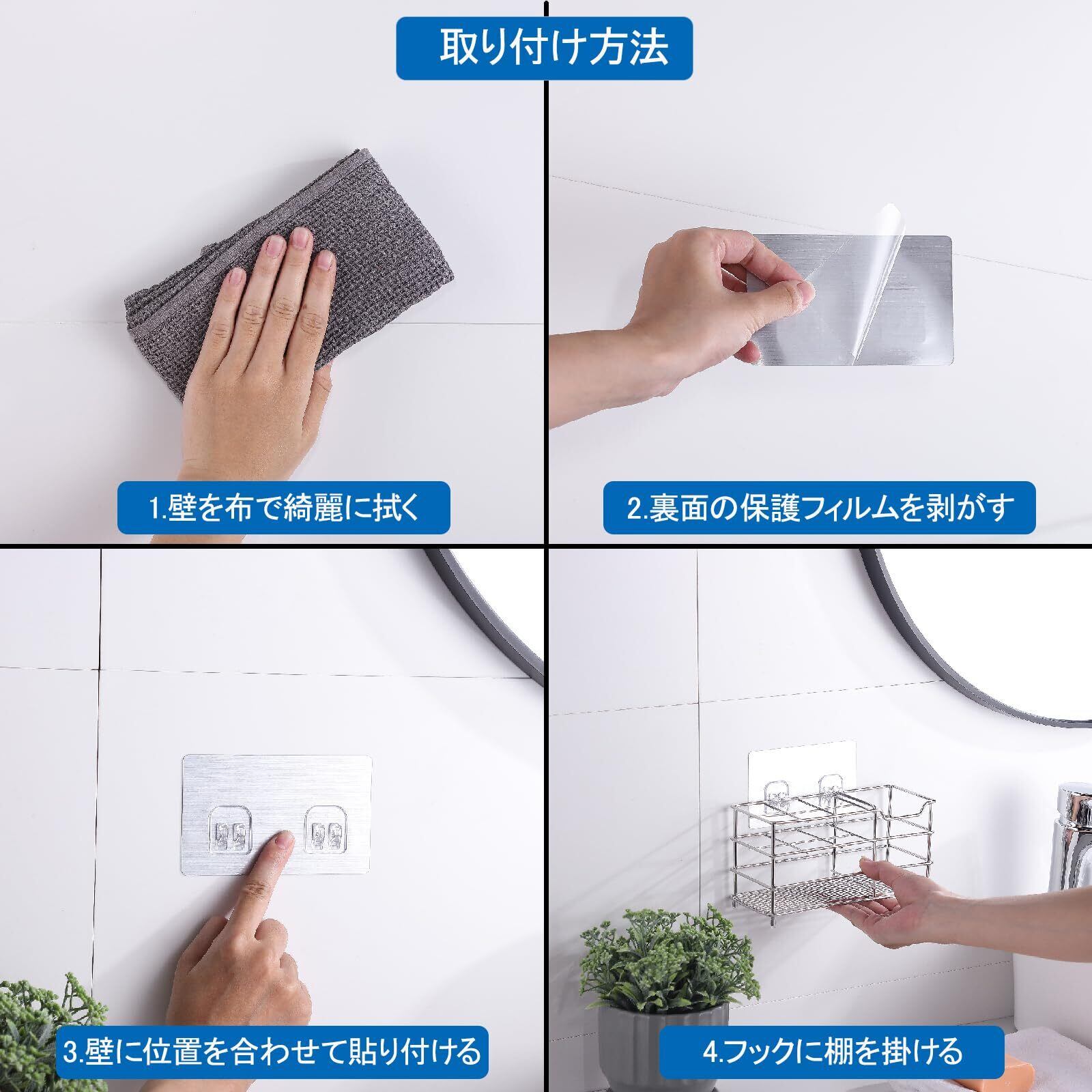 【構造設計】歯ブラシ収納溝×4 + 歯磨き粉スタンド×1;溝の寸法は日常使いの歯ブラシや歯磨き粉に最適な設計;ツルツルの壁面にも対応する取り付け用粘着テープ付属;;ドリル不要・3秒で設置可能